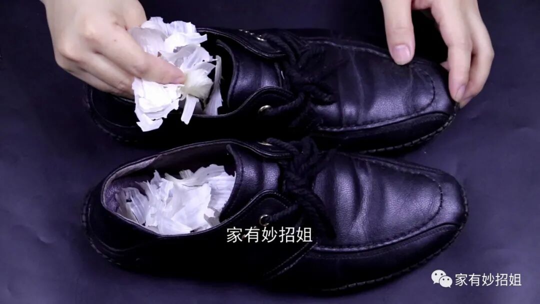 在这炎热的夏天,我们的脚特别容易出汗,而出汗后就会导致鞋子里面湿漉漉的,鞋子一脱,还会散发出难闻的脚臭味。遇到这个问题,我们就可以利用上大蒜皮。方法也很简单,只需要抓一把大蒜皮直接放在鞋子里面。大蒜皮中的大蒜素就具有杀菌的作用,可以有助于将鞋子里面的细菌消灭。而且大蒜皮本身就是干燥的,放在里面也能吸收掉鞋子里面的潮气,使鞋子变得干爽。就这样放置一个晚上后,再将里面的蒜皮倒出来,我们可以发现鞋子就变得干爽了,里面的异味也消失了,效果非常明显!