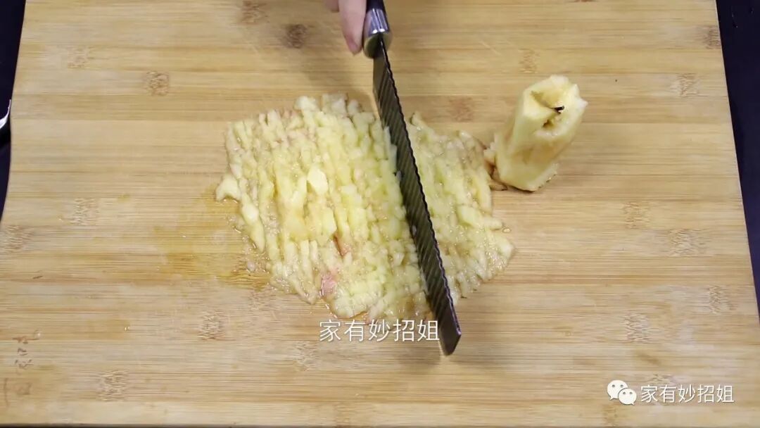 方法很简单,先把苹果腐烂的地方用刀削掉不要,然后再把剩下来的苹果切成片,再切成碎末。尽量把苹果切碎一些。切好,先放一边备用。