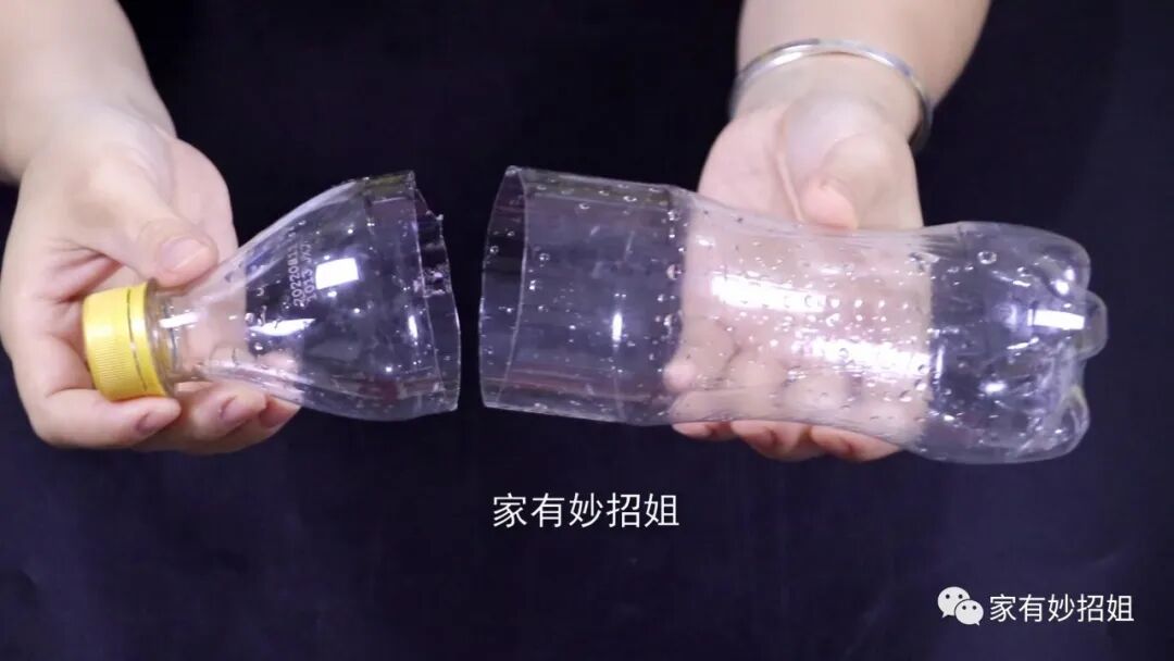 接着,我们还需要准备一个空的塑料瓶,就是我们平时喝的饮料留下来的塑料瓶都可以。用剪刀将瓶子上半部分1/3的位置裁剪下来,瓶子的上半部分就不需要了,我们只需要利用到下半部分。