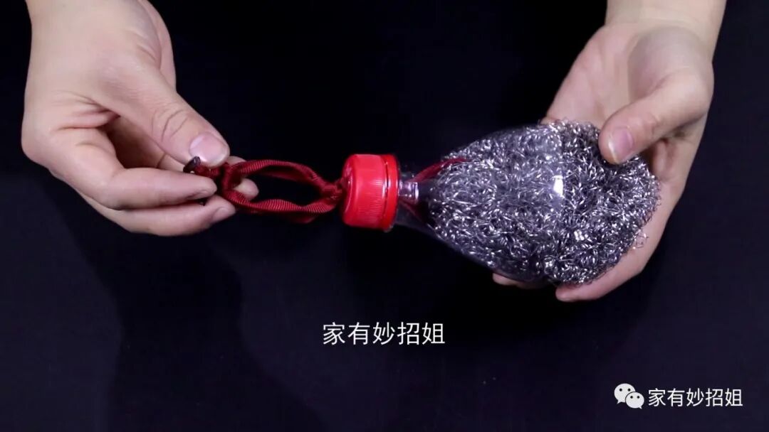 绳子穿出来后,再将瓶盖拧紧,然后把绳子拉紧并打上一个结。接下来,我们在绳子的末端也同样地打上一个结,这样一个刷锅的神器就完成了。