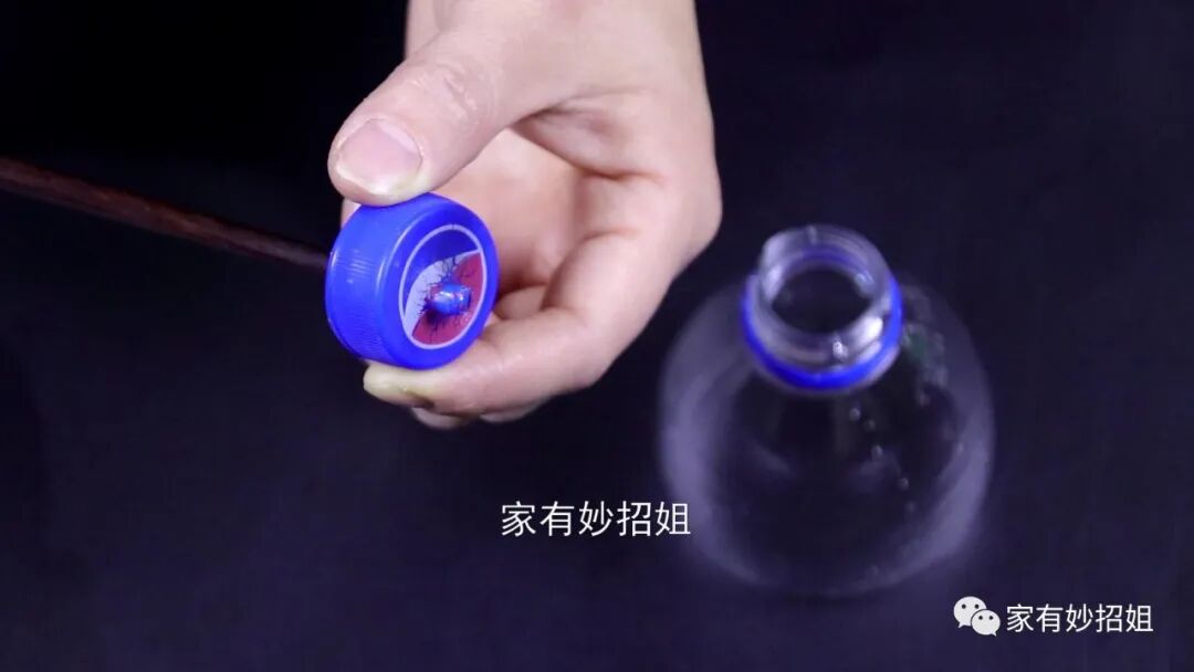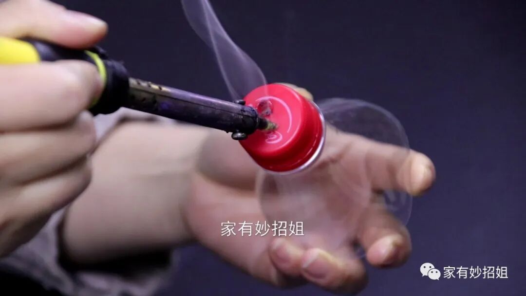 接着,我们再将瓶盖拧下来,然后用电烙铁在瓶盖的中间戳上两个洞。洞也不需要太大,可以穿进绳子就可以了。