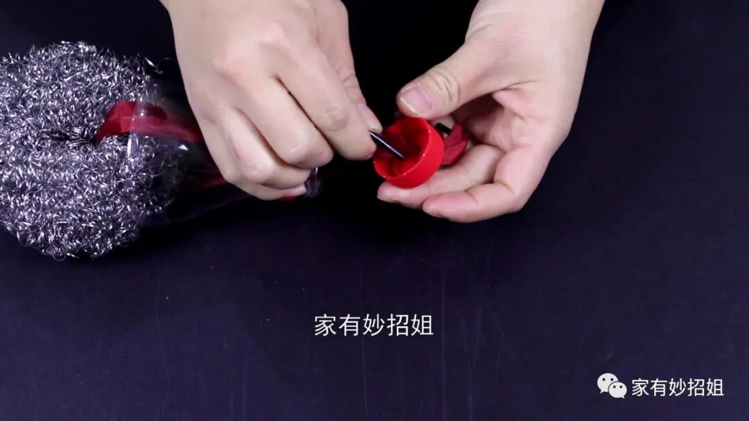 洞戳好后,我们再准备一个钢丝球和一根稍微长一点并且比较牢固的绳子。接下来,我们只需要将绳子穿过钢丝球的中间,然后再将绳子的两头穿过塑料瓶,再分别从瓶盖的两个洞里穿出来。