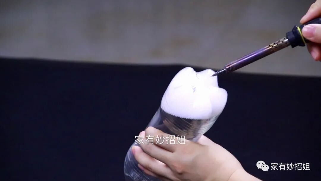 我们将白醋、洗洁精和花露水都倒入瓶中后,再往里面装入八分满的清水,摇晃一下,使里面的物品充分溶解到水中。接着,我们再把瓶子倒置的放置,这样在瓶底的部位就会有一部分的空隙。接下来,我们再用电烙铁在瓶底的空隙处戳上几个小洞,洞也不需要太多,大概两三个的样子就可以了。要是家里没有电烙铁的,我们也可以拿个铁钉烧红后再来戳洞,也非常的简单快速。洞戳好,这个清洁马桶的溶液就制作好了。