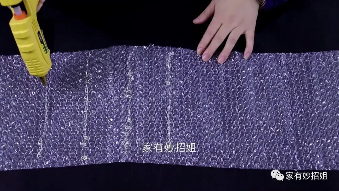剪刀、螺丝刀、老虎钳等,都是我们家里必备的工具,这些工具大多都是铁制品,一旦受潮后就很容易生锈,而且这些工具比较尖锐,如果不好好收纳的话,不仅会生锈,而且被孩子拿着玩耍就非常的危险了。其实我们可以利用气泡垫来制作一个工具收纳包。我们先准备一块大一点的气泡垫,将气泡垫从中间对折一下,然后在其中一边的气泡垫上用热熔胶打上一格一格的,接着,再将另外半边的气泡垫覆盖在上面。