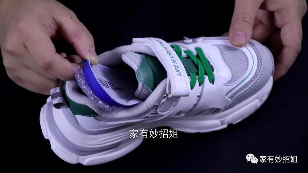 将两只鞋垫都剪好后,我们再把剪好的气泡鞋垫垫到鞋子的里面,鞋子本身的鞋垫垫在上面。这样我们再来穿鞋子的时候就会发现,鞋子明显感觉软很多,它就能起到一个防滑、防震的作用。