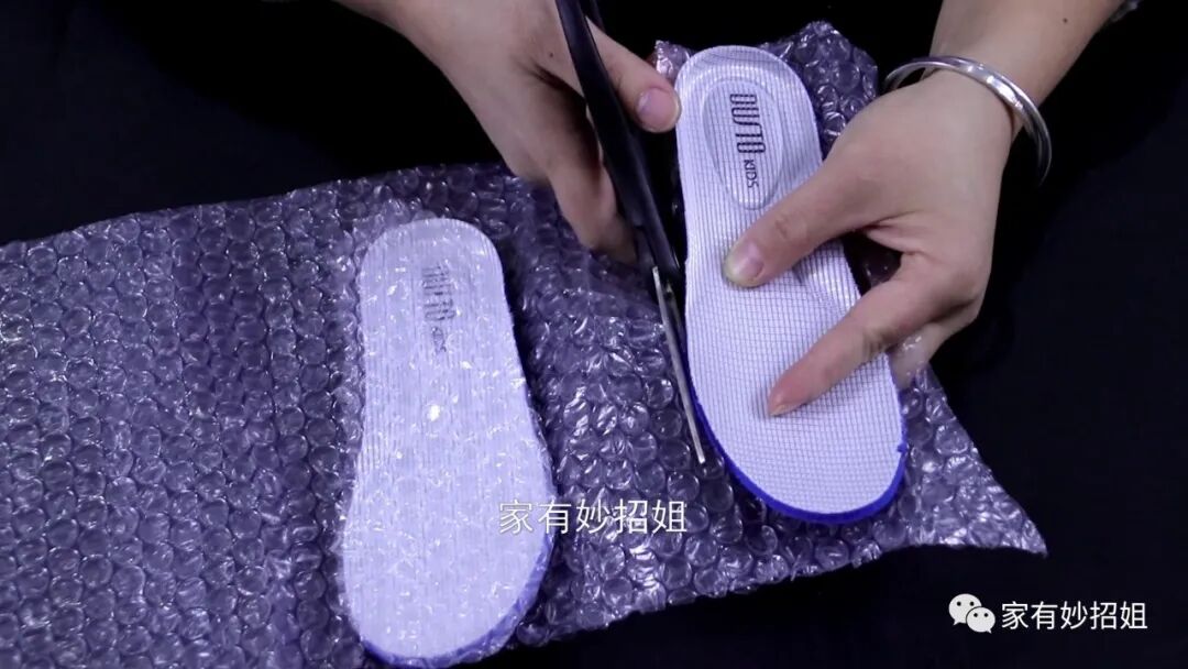 我们先将鞋子里的鞋垫取出来,然后放在气泡垫上,用剪刀比着鞋垫的大小剪出一块同样大小的气泡垫。