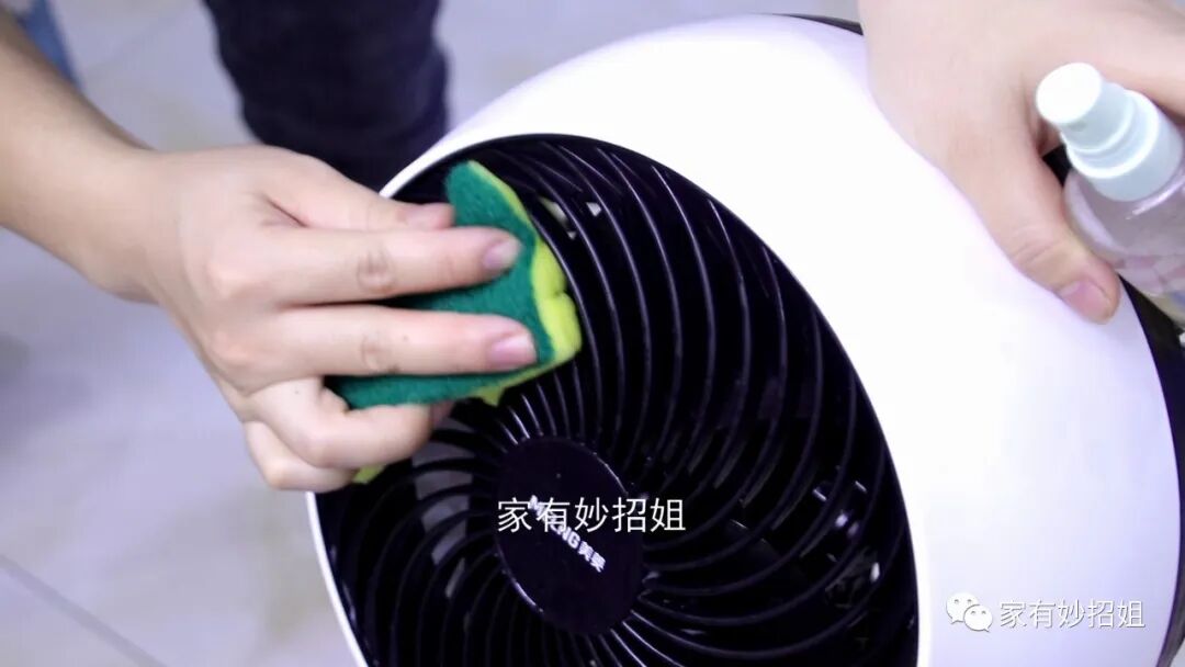 接着我们用刚刚的溶液将百洁布喷湿,喷湿后,就可以用它来擦拭电风扇的网罩了。百洁布上的小格子刚好可以伸入到网罩的缝隙中,这样就可以将缝隙里面的脏东西都清洁出来了。