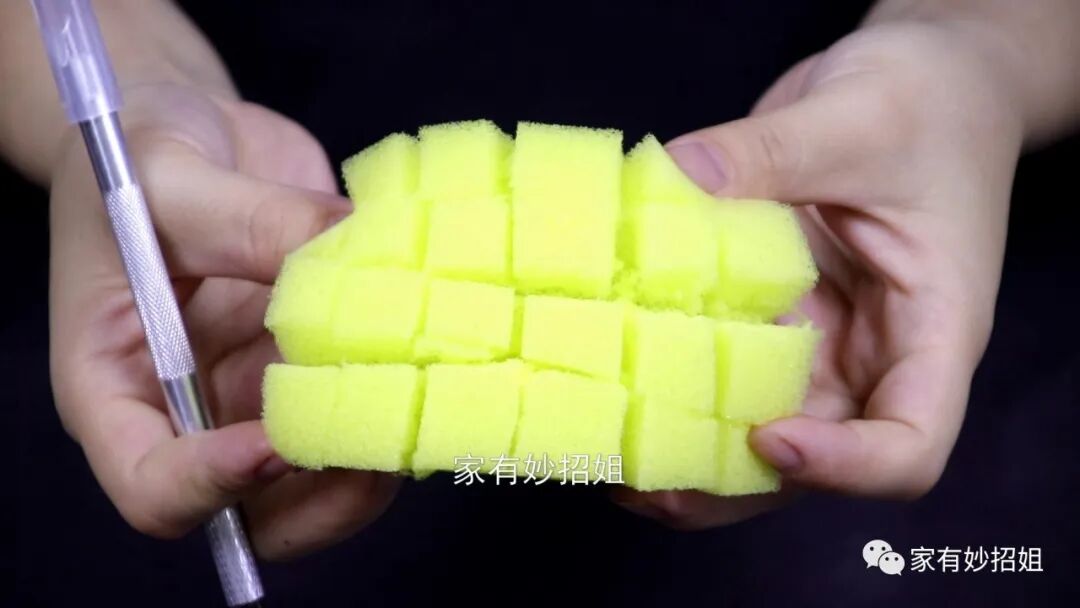 扇叶清洁好,我们接下来清洁网罩的部分。由于网罩的缝隙非常小,而且都是一格一格的,清洁起来就比较费力了。遇到这样的问题,我们还可以利用上一块百洁布。先用小刀在百洁布上横着划几刀,竖着再划几刀,使百洁布变成一些长方形的小格子。