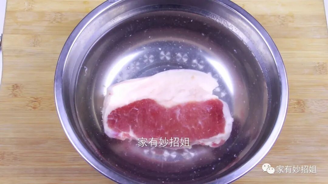 我们就这样让它泡上10分钟的样子就差不多了,这个时候肉的表面已经变软了,我们再来切就变得很简单了。