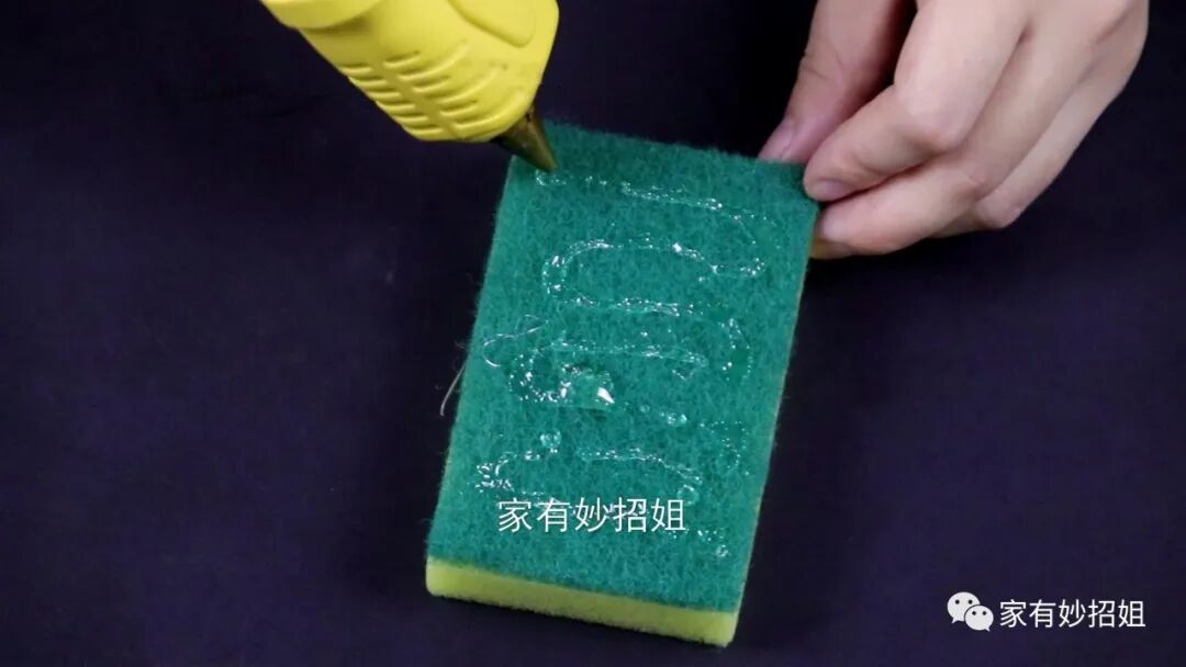 剪下来之后,我们再拿一块百洁布,用热熔胶将剪下来的橡胶手套粘在百洁布上,然后再把多余的部分修剪一下,修剪成百洁布差不多大小,这样就改造完成了。