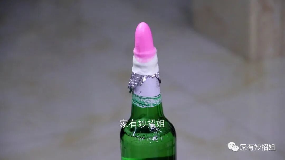 这个时候我们就可以先用锡箔纸将瓶盖盖住,然后再拿一个我们剪下来的橡胶手指套套在瓶口子上面。由于橡胶手指套的弹性是非常好的,我们把它套在酒瓶上面,就可以牢牢地把瓶口密封好,使瓶子里面的气体不会跑出来,我们下次再喝时,就还是和原来一样的了。