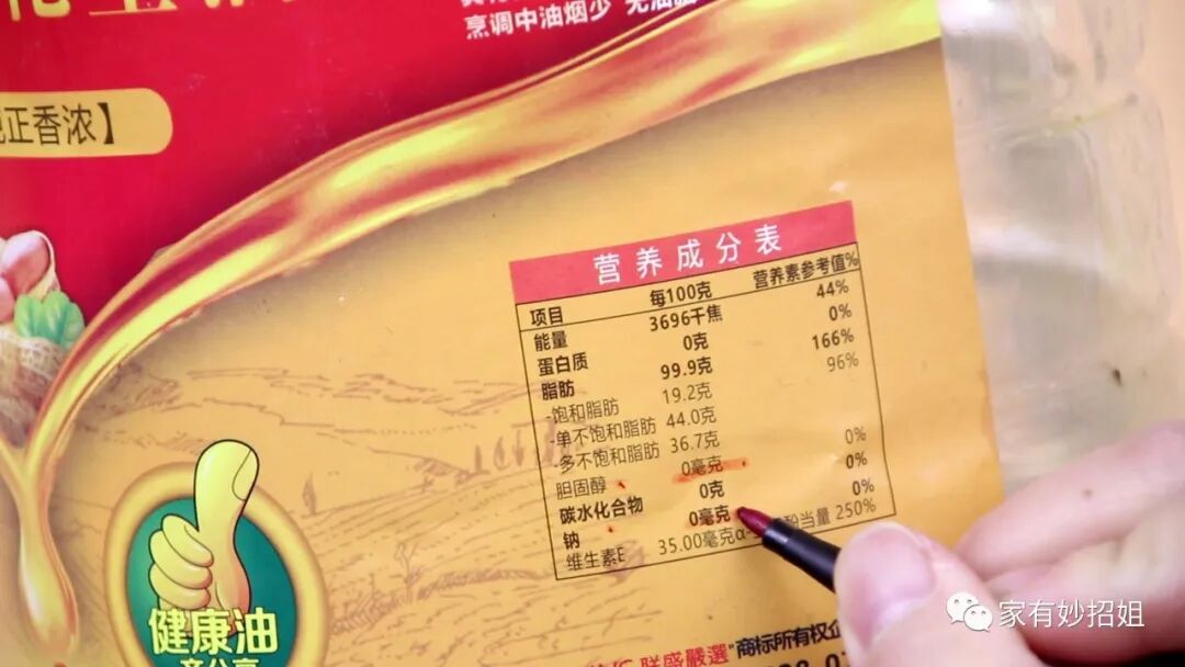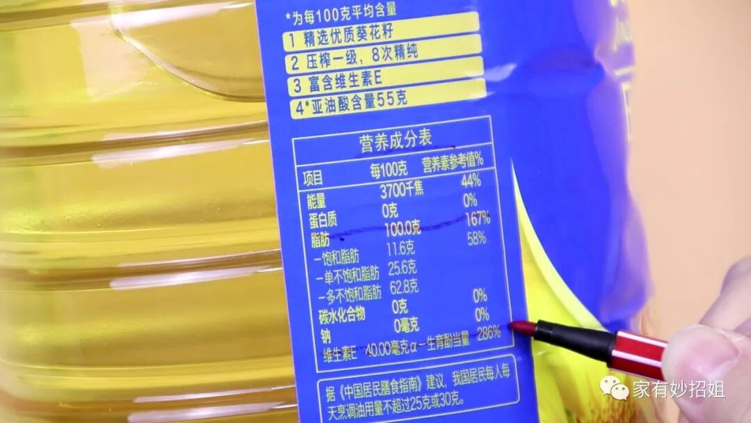 所有的食用油包装上都标明了营养成分。这里我们重点看下脂肪和维生素e的含量,这两个含量数值越高,那就说明这个油的营养成分越好品质越高,如果这两个指标很低,也就说明这个油不行。