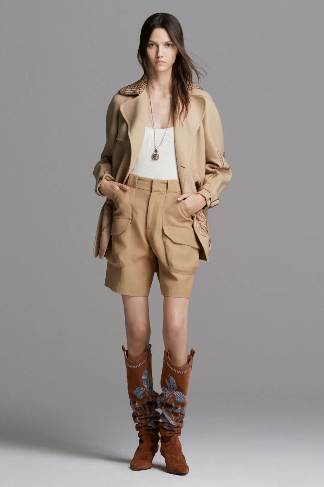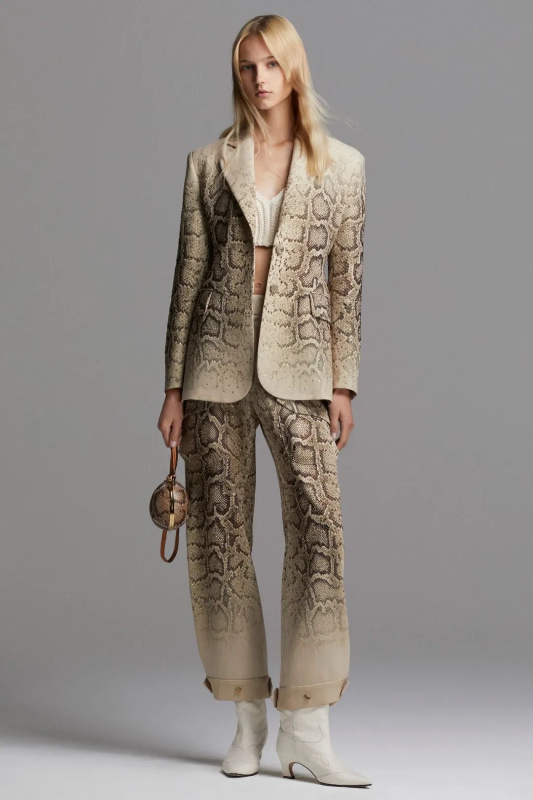 以不断的旅行作为灵感来源的Ermanno Scervino展开了24度假系列设计,这个季度品牌尝试了纺织品研究和手工技术。继续采用Marocain技艺,以牛仔效果印在上衣、裤子、裙子和外套上,质地轻盈。将蟒蛇印花突出展现在各种单品上,西装、系带紧身胸衣和长棍裙,以及带有激光切割细节的Nappa皮夹克,低饱和度战士淋漓体现。