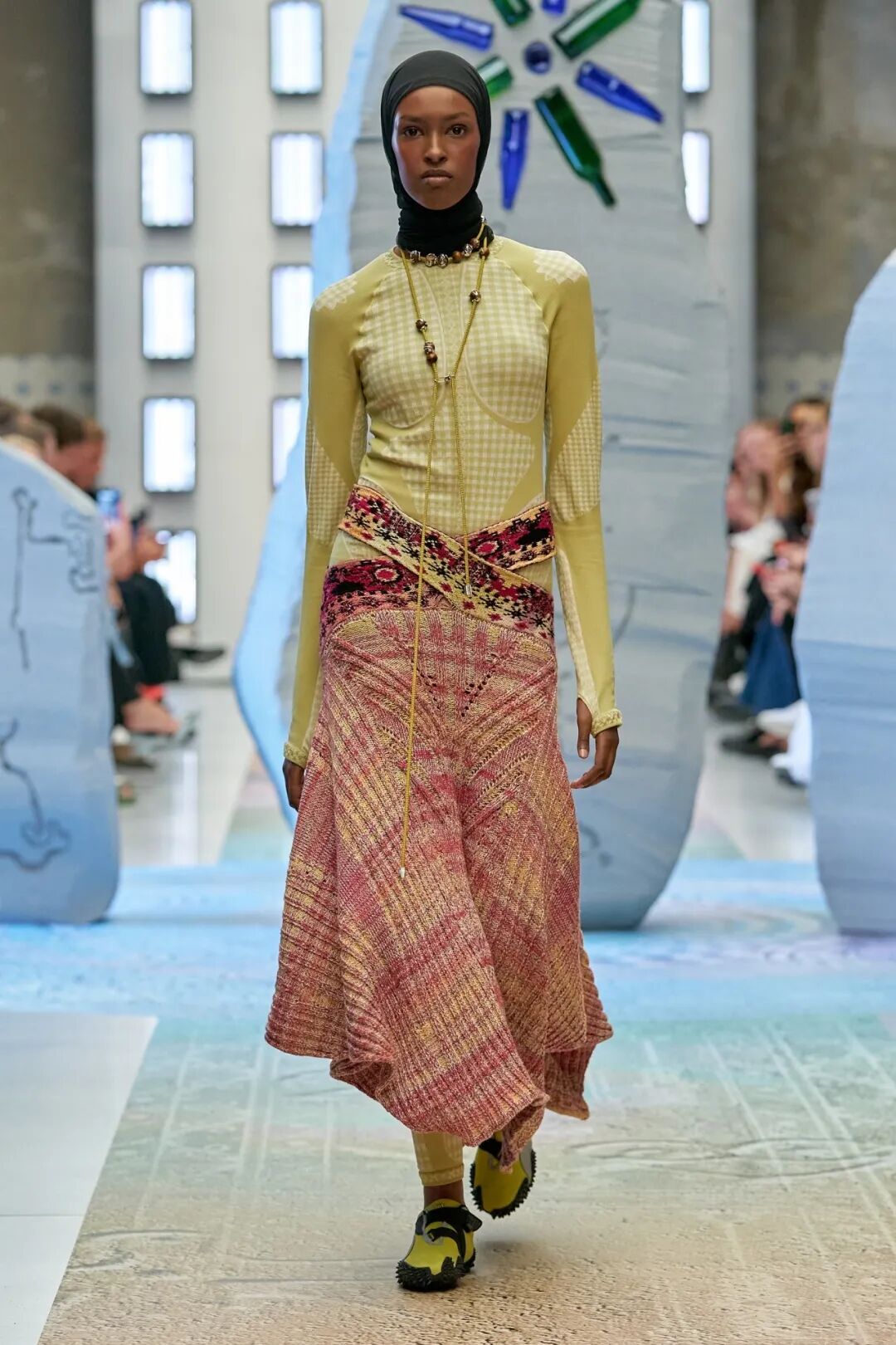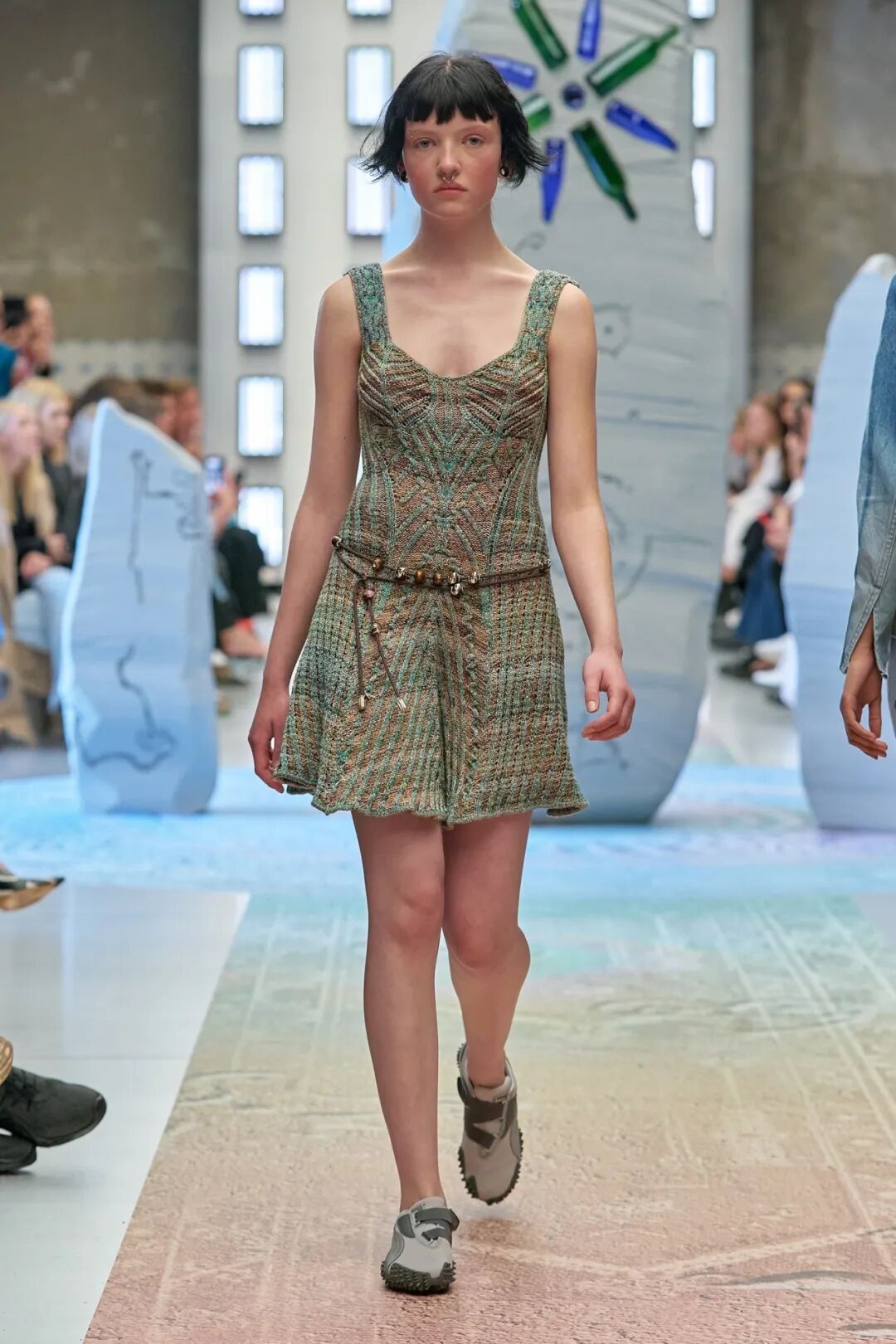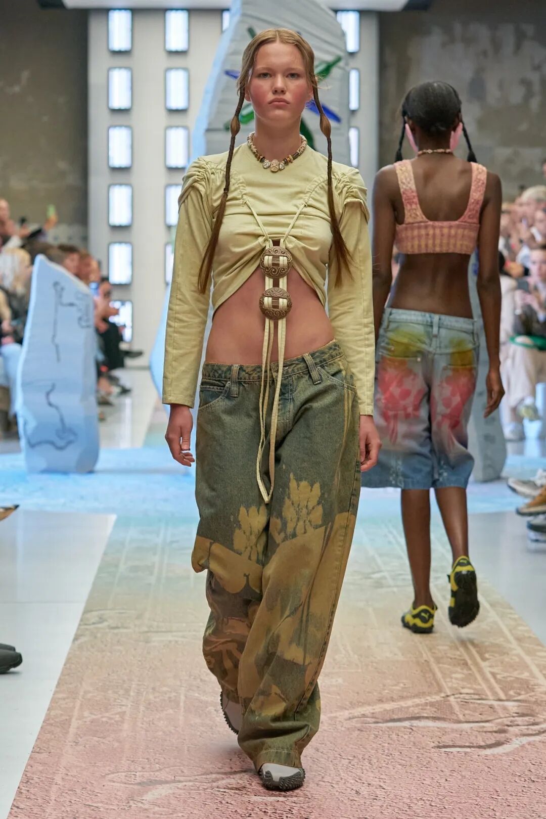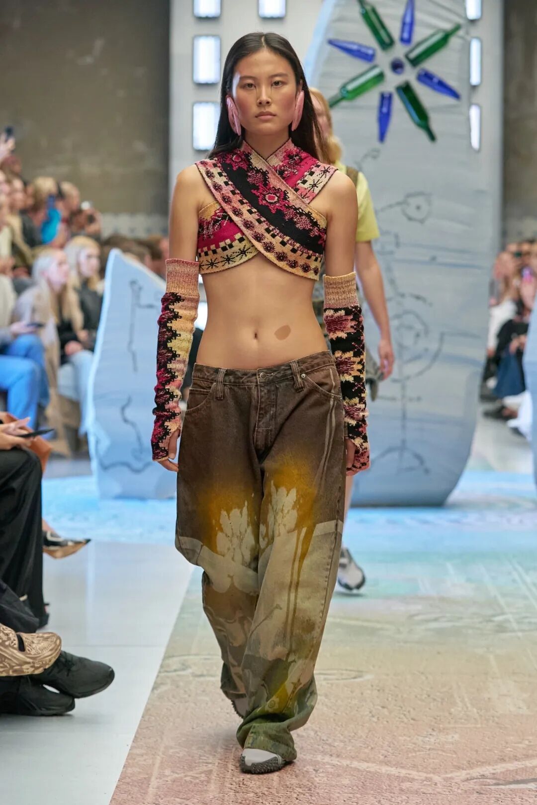 Paolina Russo将该系列被命名为“巨石”,以很大程度上随着时间的推移而消失的古代岩层命名。将“脏”牛仔与透视螺纹针织衫结合,同时融合民俗色彩,用彩绘符号标记,户外自然随之融合产生。流利地使用新一代的语言,具有一种与任何年龄段的自由精神对话的精神。