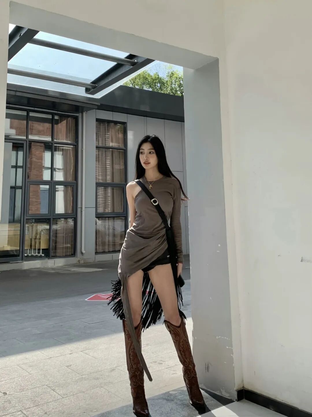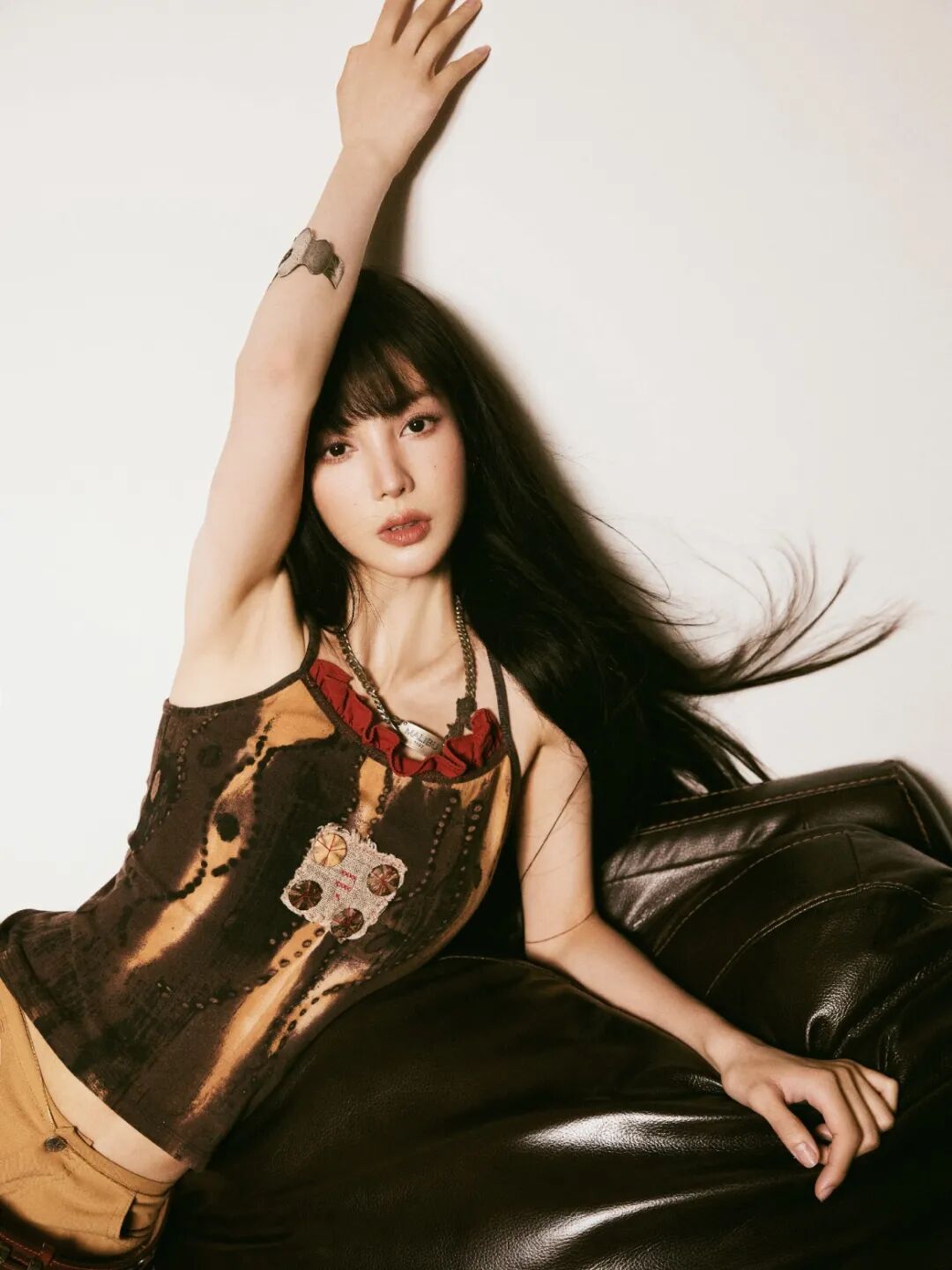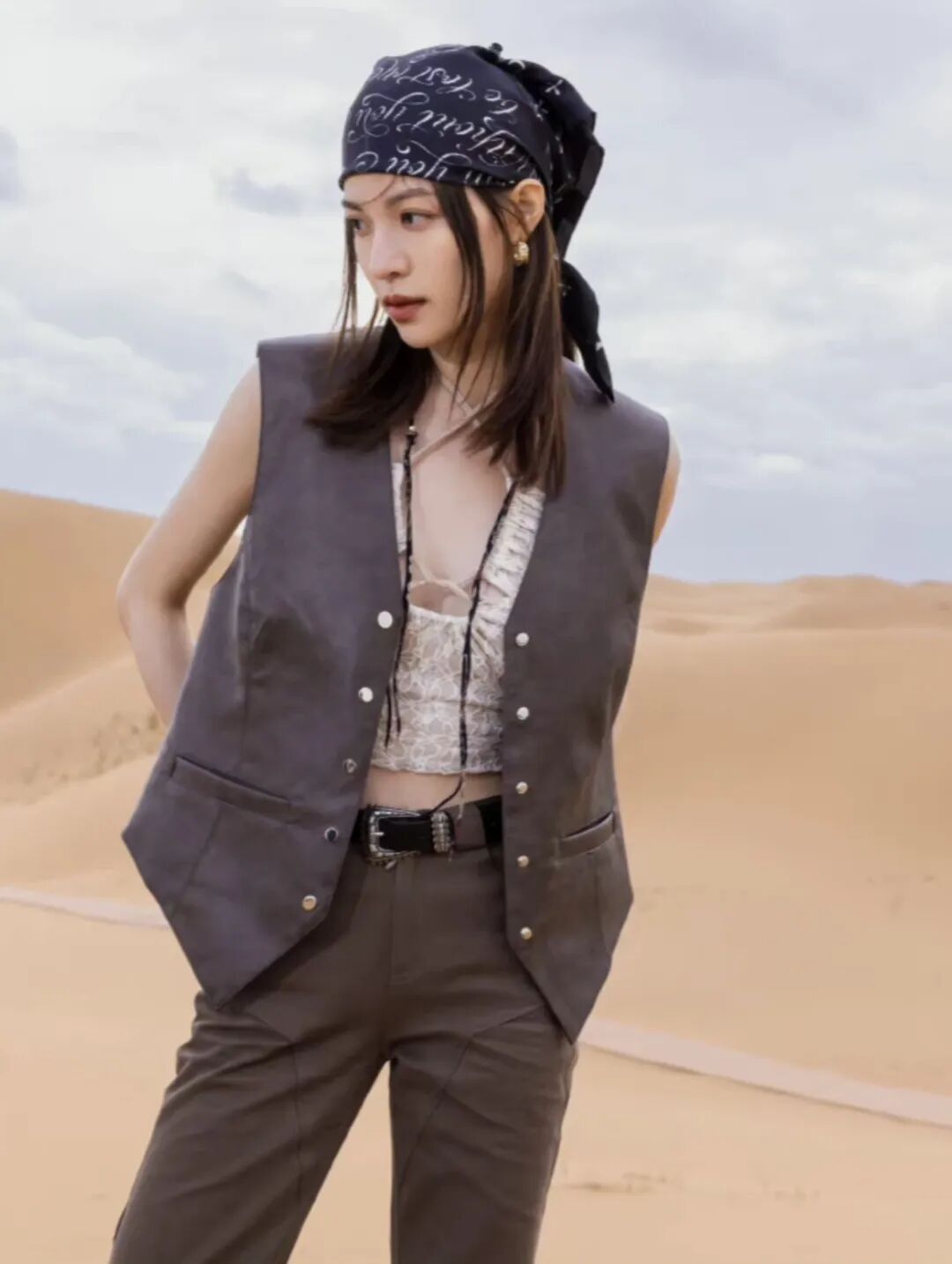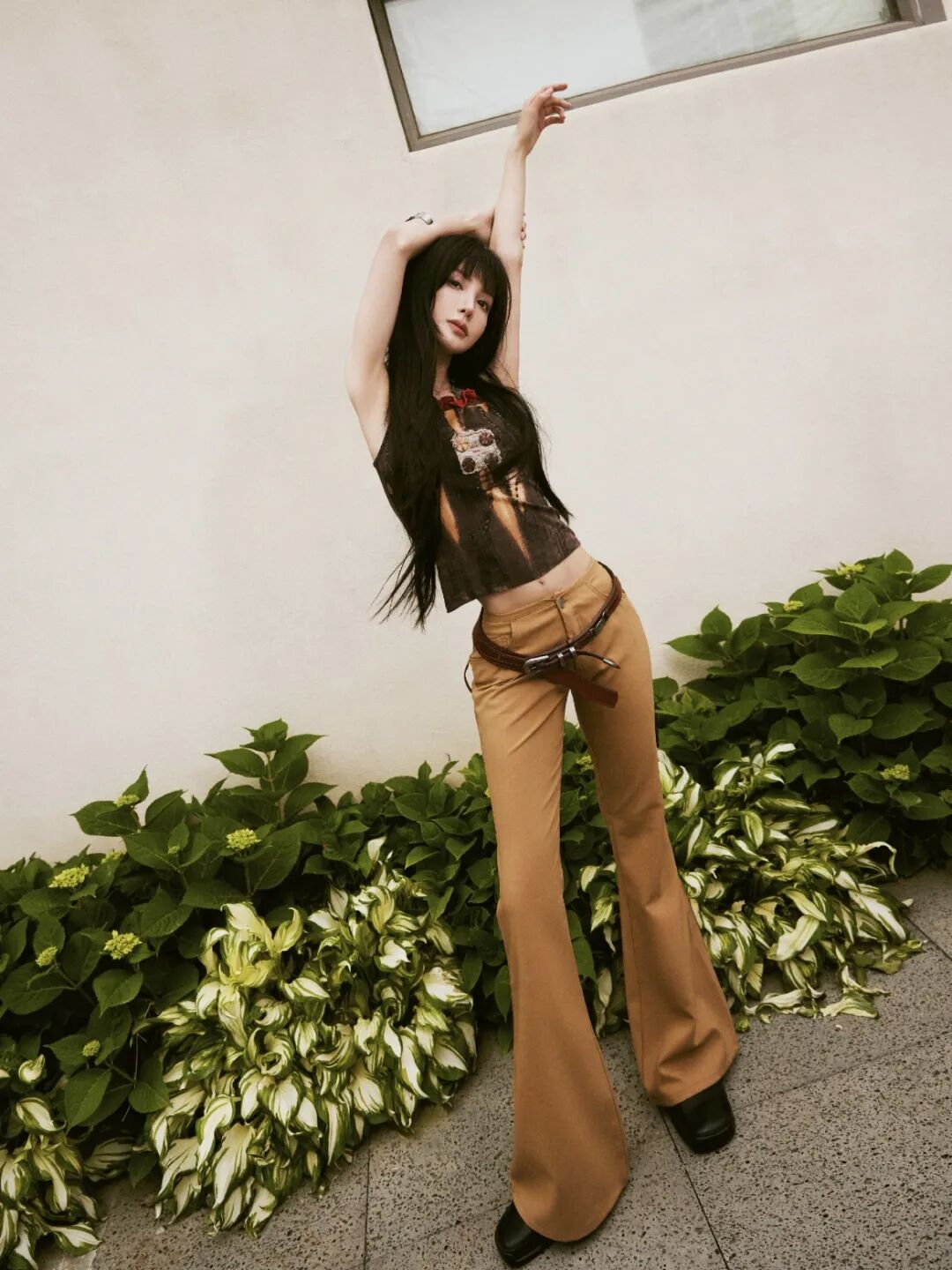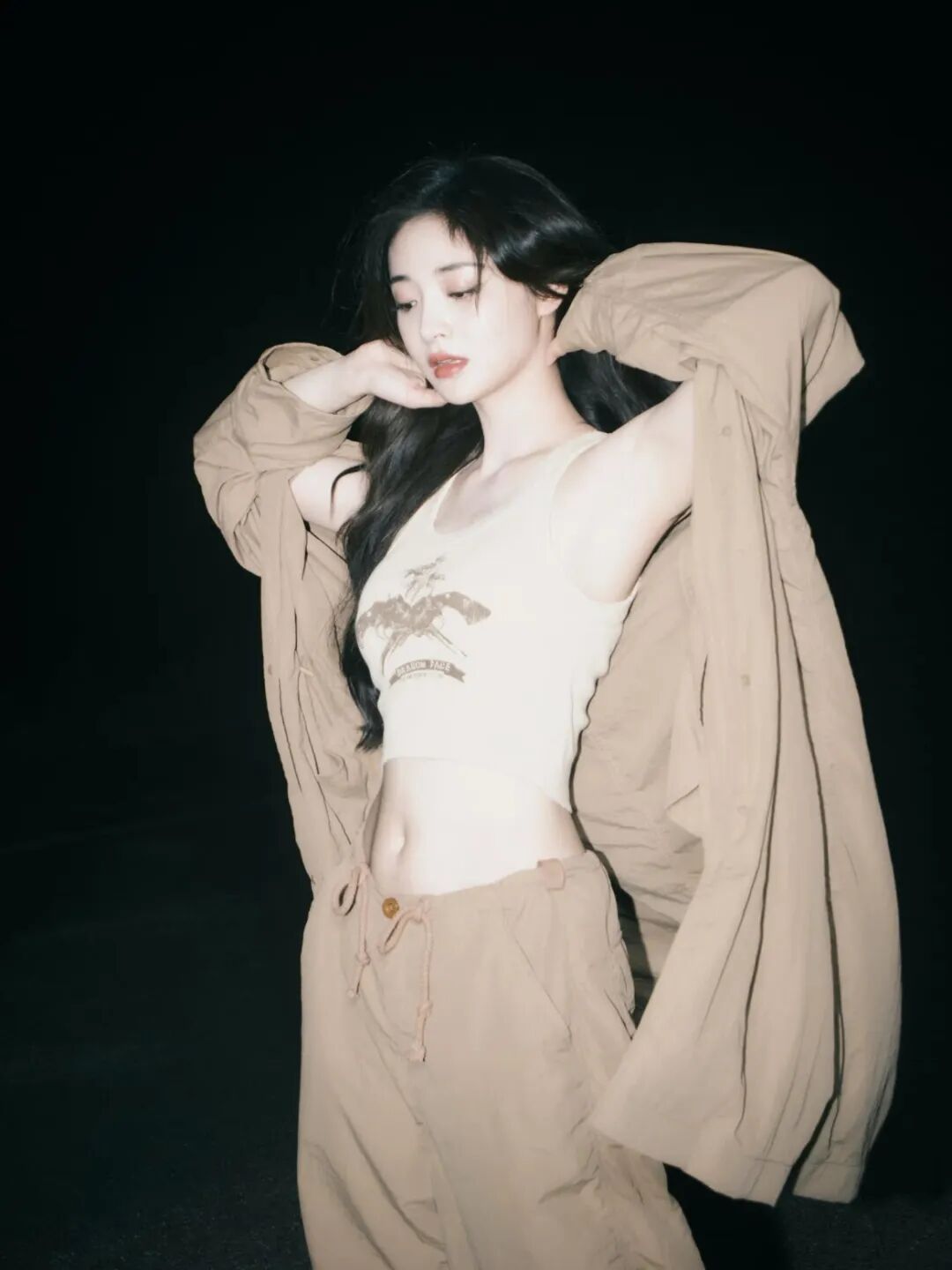 金晨这组大片造型完美展现她的独特风情,在尽情营造冷酷氛围的同时也不失妩媚之力。深棕色的设计感吊带背心搭配土黄色紧身微喇裤,整体色彩维持一个低饱和的深色,充满大自然土木风味。仿佛可以想象到身着这身精致完美look游走在西北荒漠之中的情景,将大自然的无边无际尽收眼底。
