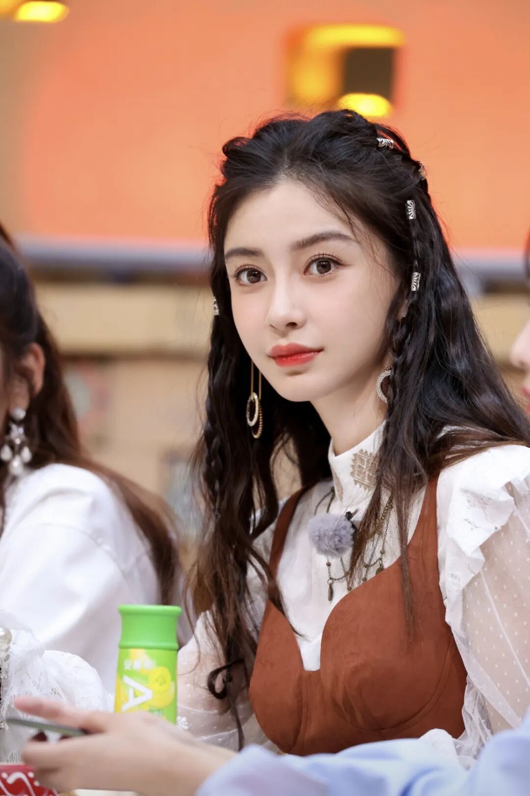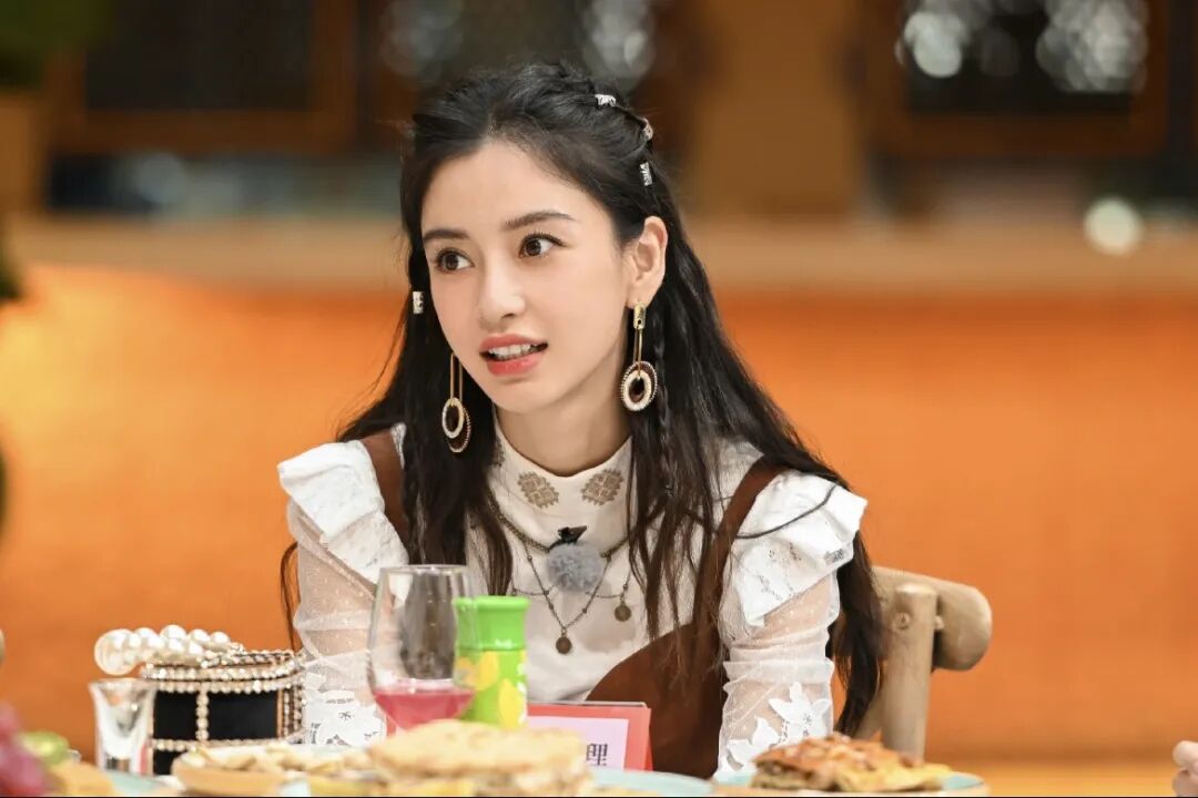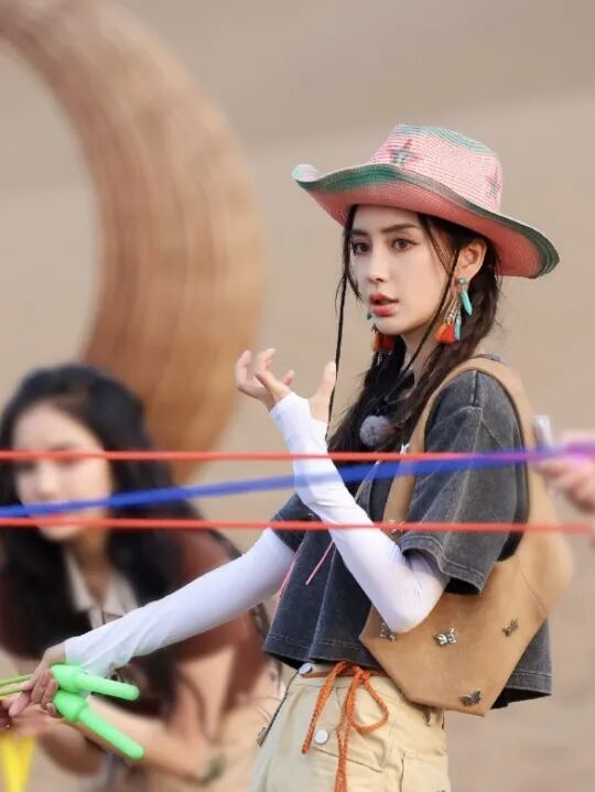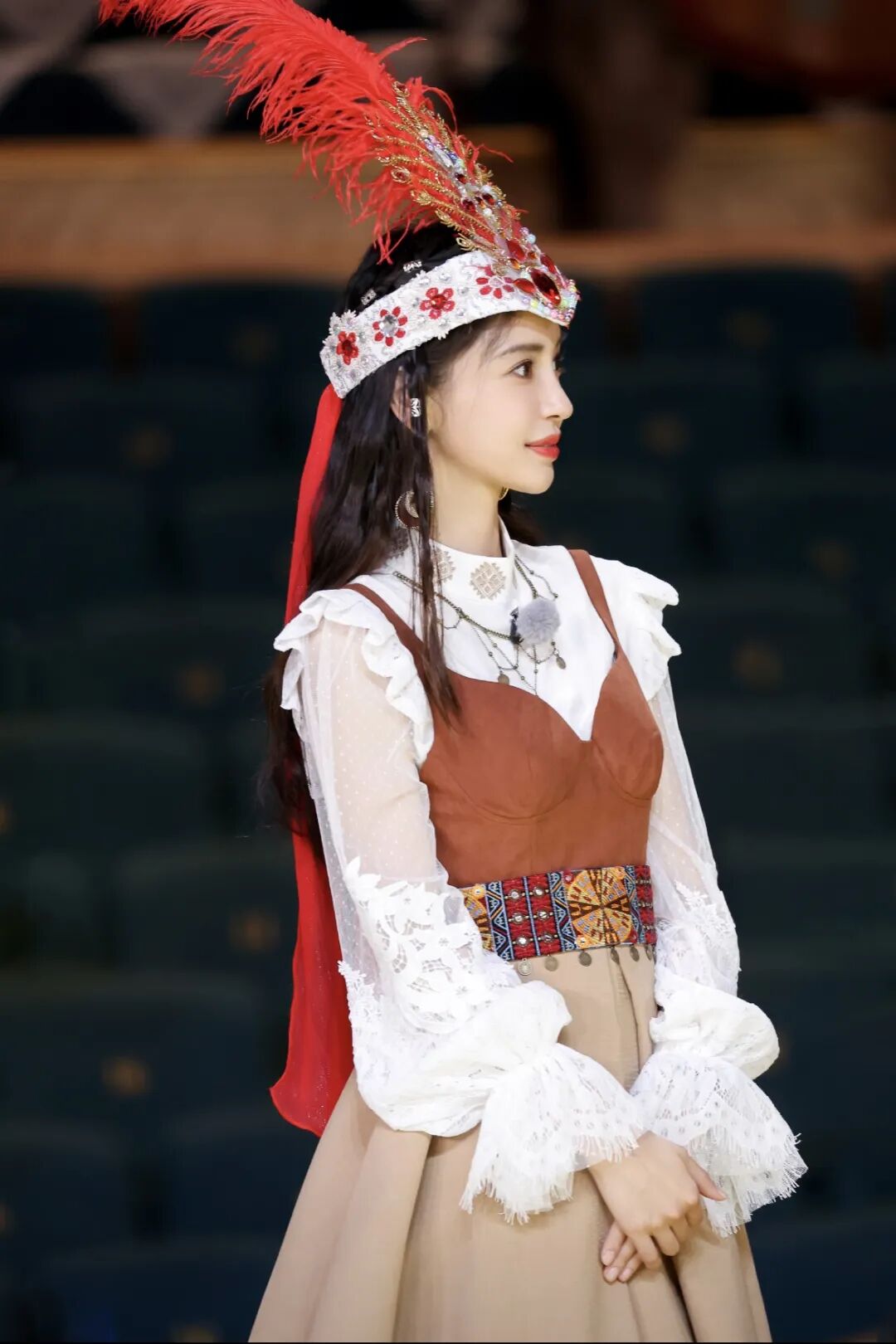 Angelababy在节目中的这组造型展现满满塞外风情。蕾丝花边的Vintage衬衫搭配砖红棕色拼接卡其色的民族风格吊带裙,再辅佐异域风情的耳饰与颈饰,以及特色头饰的装饰给予加分项。一个活灵活现的灵动楚人的小公主形象油然而生。