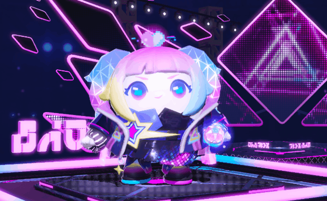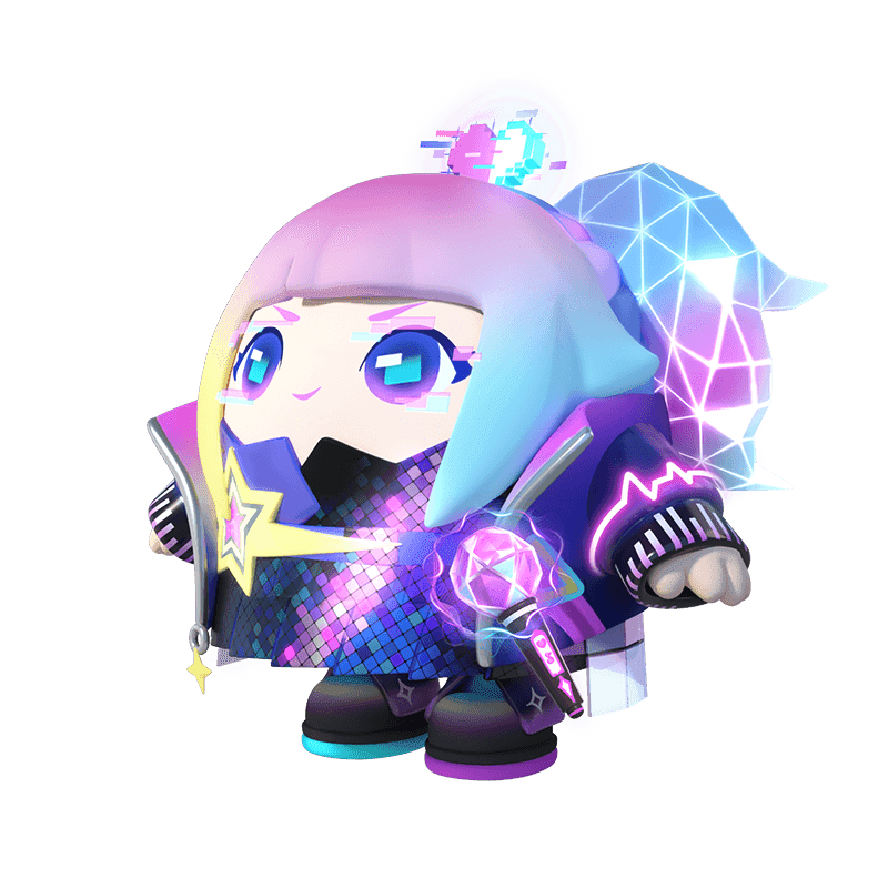 在虚拟音符的环绕下,穿越时间而来的未来歌姬曜星伴着动感节拍降临,主唱曜星扎绑着活泼叛逆的挑染双马尾,穿着特别演出服,服饰自带的镭射效果在飘扬的衣摆上闪烁着彩色荧光,音乐响起的时候,光线汇聚在舞台中央,主唱曜星嘴角自信上扬,她就是舞台上的闪耀之星。