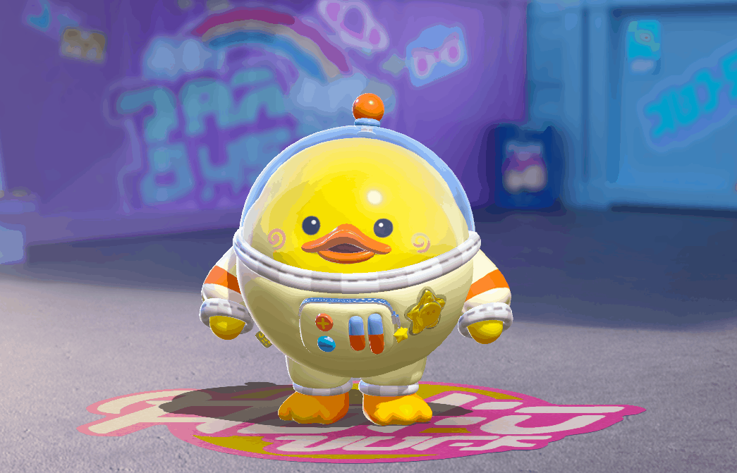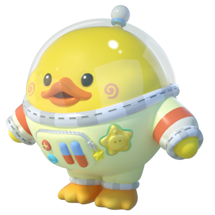 维迪是一只可爱的小黄鸭,身穿米黄色的宇航服,宇航服胸前印着金灿灿的星星标志,上面还有可以操纵机械臂的红蓝两色按钮,透明头罩下黄黄的小脑袋上长着一个小尖尖,小小黑黑的圆眼睛配上扁扁的橙色嘴巴,还有两个螺旋状的红晕,让维迪看起来呆呆傻傻的。