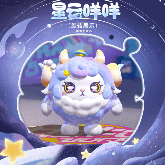 咩咩是一只在宇宙中生活的星空羊,她长着一身粉紫色的羊毛,每一团羊毛都像宇宙中美丽梦幻的星云,彩虹色的羊角上挂着精致的星星发圈,脖子上围着一圈洁白的羊毛围脖。温柔美丽的咩咩每天都会抖抖柔软的羊毛,将自己刘海打理得一丝不苟,让自己看起来星光闪闪,魅力可爱。