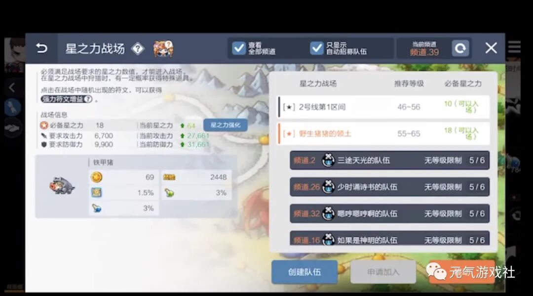 然后这个时候呢,我们打开自己的星之力战场啊,然后点开星之力战场之后呢,我们直接去这个野生的猪猪领土啊,这个里面寻求队伍啊,一定要组一个满编队,最好是能带主教的,我们在里面呢,先挂一个小时的机啊,差不多就能到60级了,