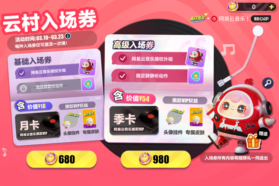 云村入场券分为两种,其中基础入场券售价680蛋币,里面包括云村音音皮肤、网易云音乐黑胶VIP月卡(价值18块钱);高级入场券售价980蛋币,里面包括云村音音皮肤、限定静静听动作、网易云音乐黑胶VIP季卡。