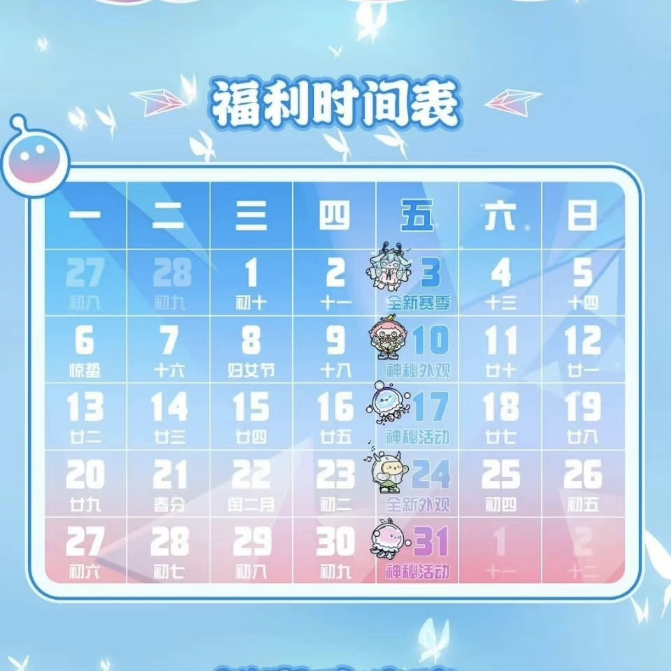 蛋仔派对每周星期五游戏更新,更新前都会提前放出新活动、新皮肤的情报消息,三月份的进度已达五分之二,根据官方福利时间表的计划安排,3月3日、10日、17日、24日、31日都会有新活动或者新皮肤。