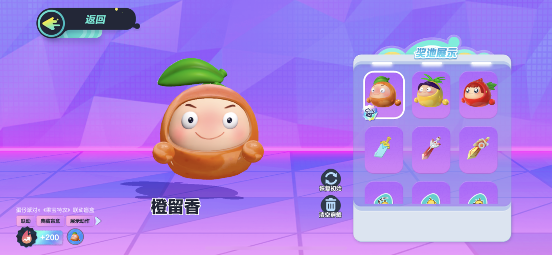本次果宝特攻联动盲盒套装有3个,分别为橙留香、菠萝吹雪、上官子怡,3个联动盲盒属于典藏品质的紫色盲盒,拥有专属展示动作、专属语音和滚动特效。