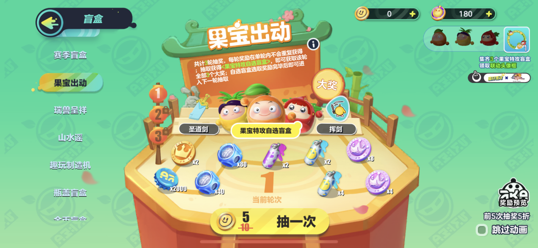 已抽取的奖励在单轮内不会重复获得,抽取12次必定保底获得【果宝特攻自选盲盒】,获得【果宝特攻自选盲盒】后,可从橙留香、菠萝吹雪、上官子怡三个盲盒中选择一个喜欢的外观皮肤。若抽到“自选盲盒”大奖时未抽到其他大奖,则自动获得其他大奖,并进入下一轮抽奖。