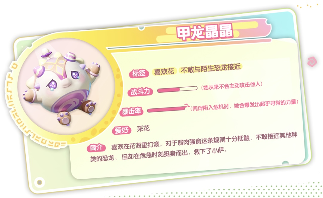 胆小的甲龙晶晶不敢接近陌生的恐龙和其他生物,常常因为受到惊吓而哭泣,所以眼角总是挂着泪花,喜欢在花海中打滚玩耍,累了会在花海中安逸的休息。讨厌丛林中“弱肉强食”这一规则,曾在危急时刻挺身救下了三角龙小萨。