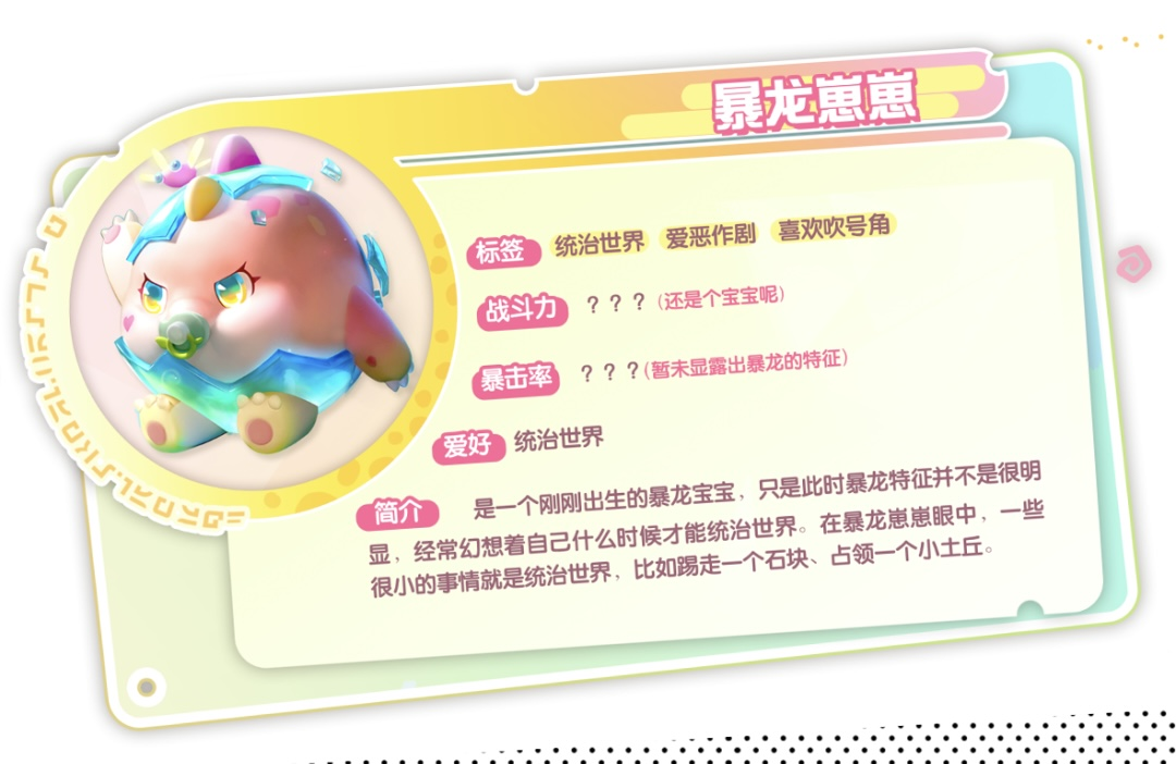 暴龙崽崽在三角龙小萨与甲龙晶晶的呵护下,顺利破壳,作为刚出生的暴龙宝宝,暴龙凶猛的特征还不是很明显,喜欢恶作剧的她拥有一个远大的目标,那就是统治世界。