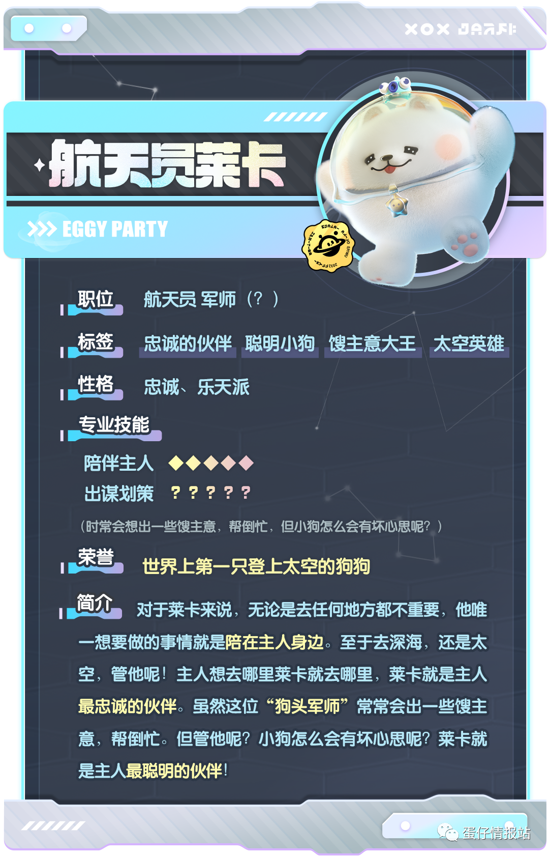 莱卡是世界上第一只登上太空的狗狗,他是主人忠诚的伙伴,在蛋仔太空小队中担任航天员职位,有时候也会想出一些馊主意来出谋划策,常被小伙伴称作“狗头军师”。