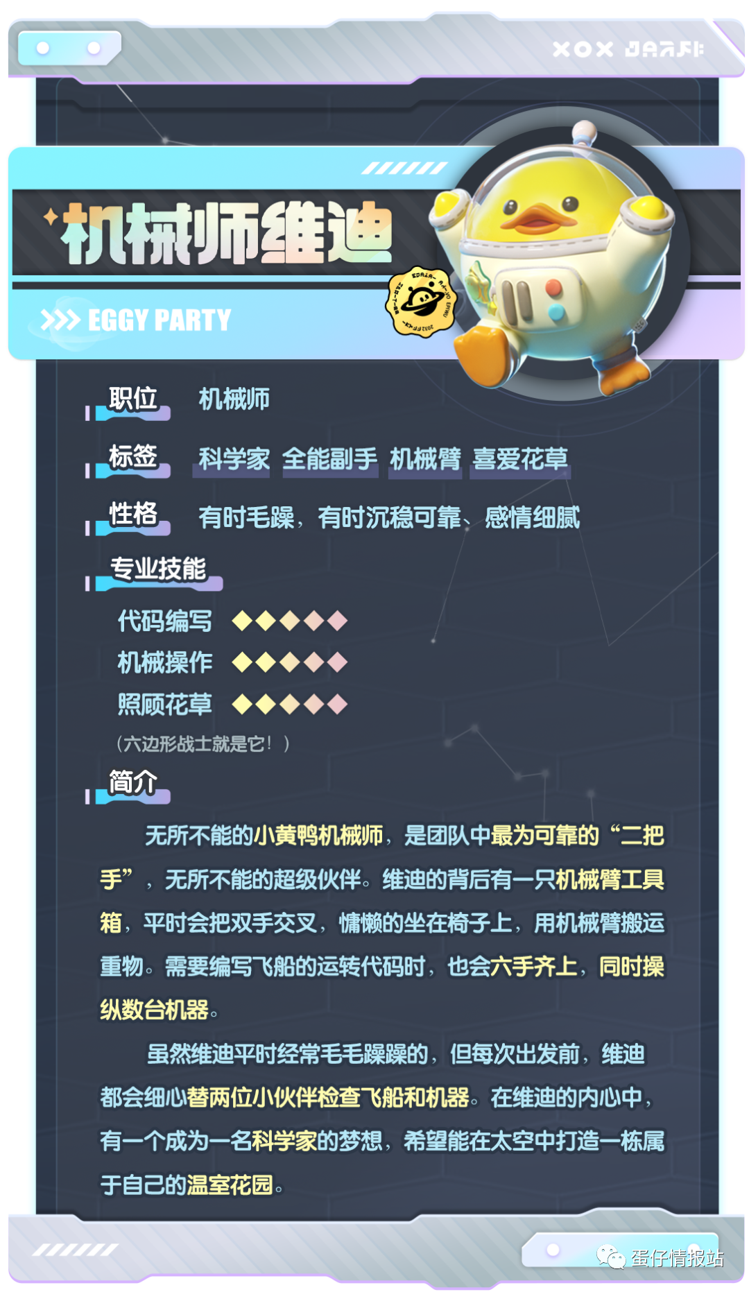 首先登场的守护宇宙新英雄是机械师维迪,他是无所不能的小黄鸭机械师,在蛋仔太空小队中担任机械师职位,全能的他可以修复任何损坏的机器设施。