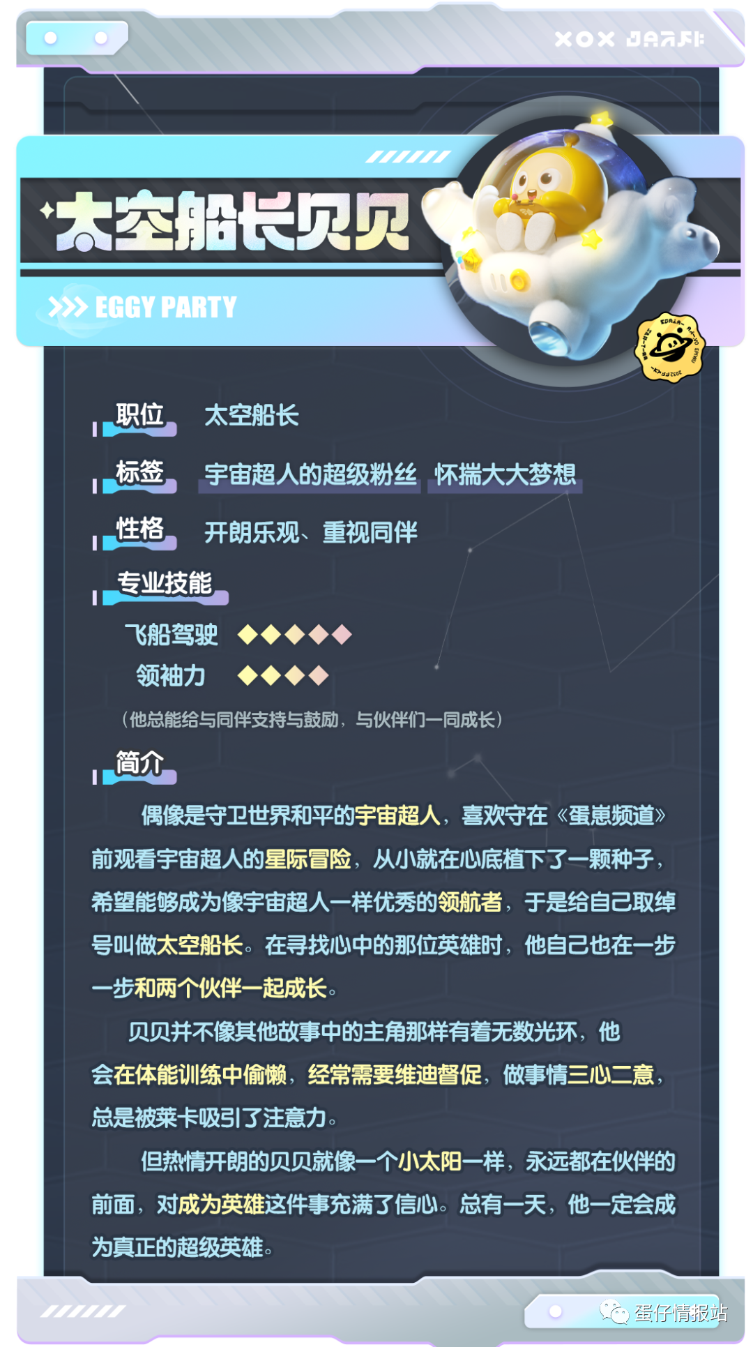 宇宙超人的失踪让他备受打击,贝贝便集合其他两位伙伴组成蛋仔太空小队,给自己取了“太空船长”的绰号,也在蛋仔太空小队中担任太空船长的职位。贝贝虽然只是一个普普通通的小蛋仔,会在体能训练中偷懒、做事情三心二意,但是热情开朗的他一直向着成为真正的超级英雄目标努力,克服层层困难险阻,和同伴一起成长。