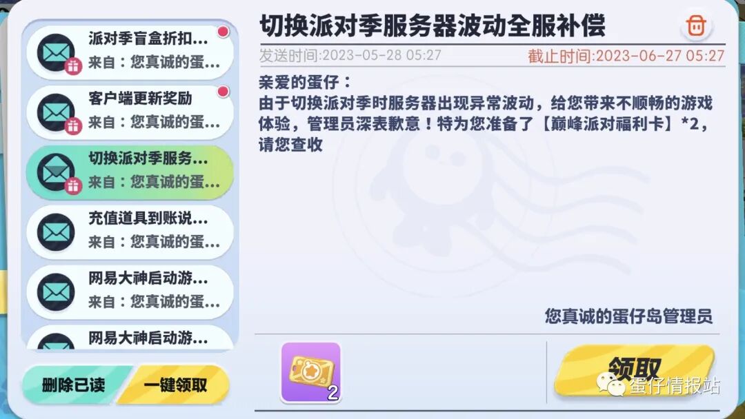 3、为表达歉意,蛋仔向全服玩家发放巅峰派对福利卡*2,该补偿生效时间截止至5月29日23:59。