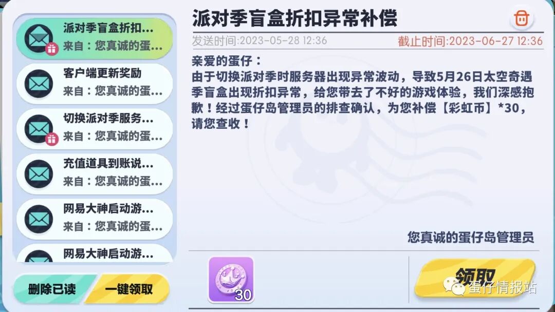 本次补偿方案预计将于5月28日凌晨4:00-6:00生效,其中彩虹币和巅峰派对福利卡将通过邮件进行发放,蛋仔们可以登录游戏在邮箱中查收补偿邮件。由于服务器生效时间差异,补偿发放可能持续一段时间,如果有上述情况的蛋仔玩家还没收到补偿的话,可以跟蛋仔派对官方客服进行反馈。