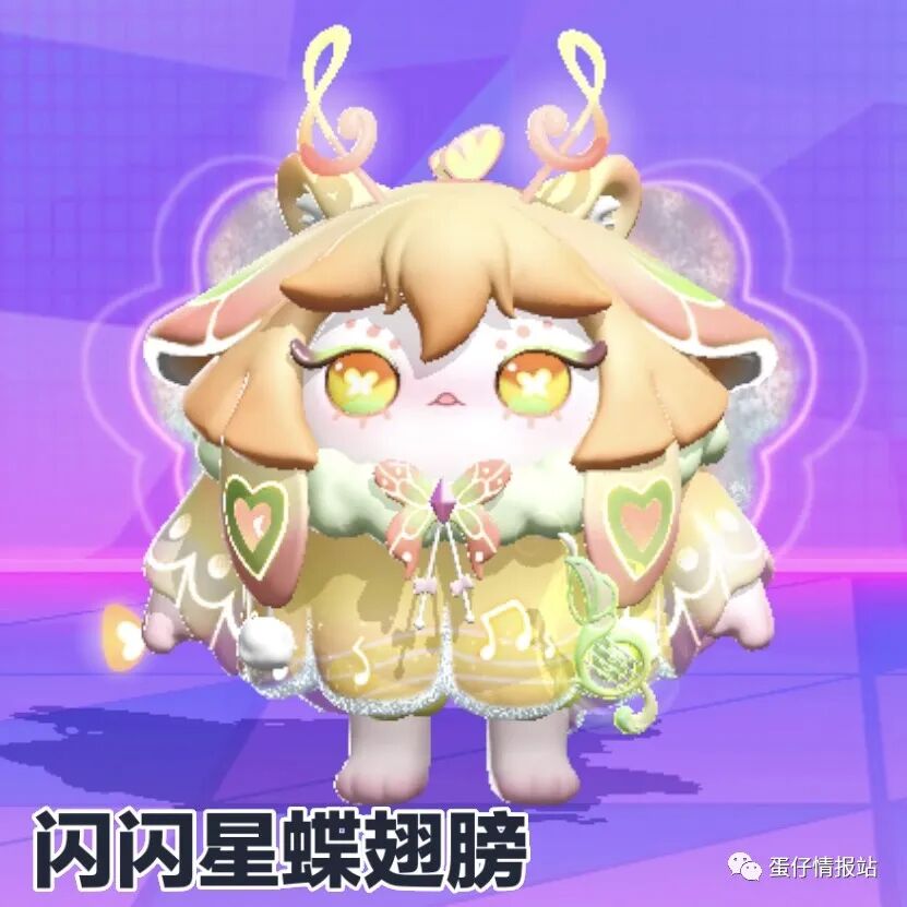 闪闪星蝶翅膀属于甜美梦幻风格,中间是一个亮闪闪的蝴蝶结,时不时冒出小爱心特效,翅膀扇动的时候周围会散发出缤纷的彩光,和精灵莉斯尔皮肤比较适配,特别是黄色的染色款,和谐的配色和相同的风格看起来就像专属配饰,也适合其他同色系的梦幻风格皮肤。
