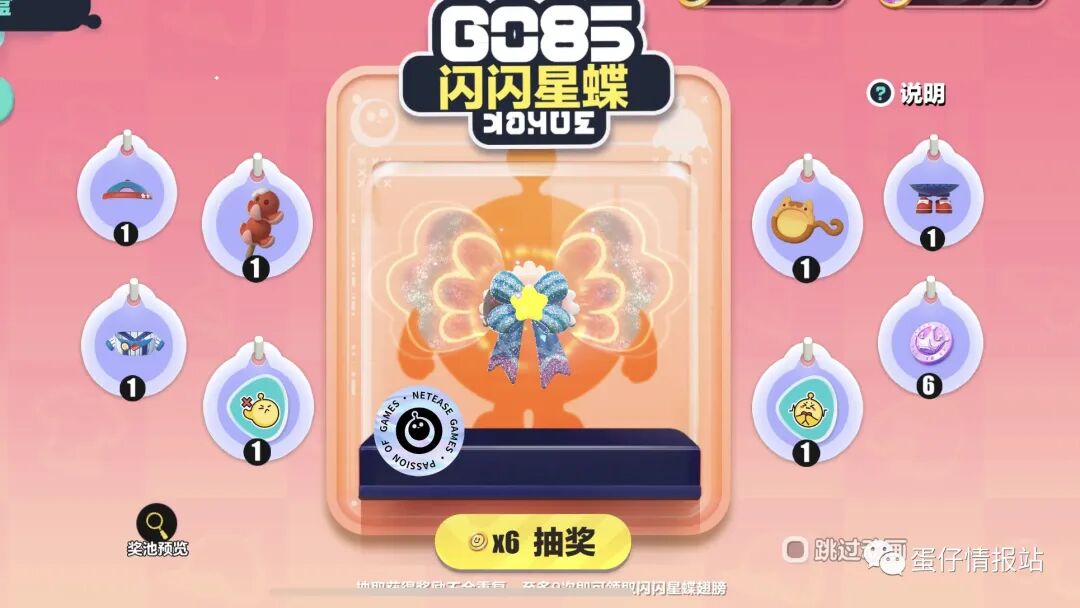 蛋仔玩家使用许愿币在闪闪星蝶奖池中抽奖,奖池中包括9个奖励,包括【闪闪星蝶】至臻配饰、【竹签小章鱼】【喵盆大口眼镜】典藏配饰、表情、街头滑板仔套装、彩虹币奖励。每个奖励抽中概率不一样,已抽取到物品的概率将分到未获得的剩余物品上。