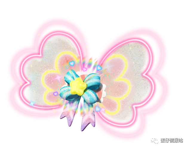 【闪闪星蝶】是一对缤纷的蝴蝶翅膀,五彩的外形就像名字一样闪闪动人, 粉蓝色缎带和甜美的蝴蝶结相得益彰,星星的点缀更是让它闪闪发光,半透明的花瓣形羽翼轻柔振动,泛出层叠光波与爱心亮片。背上这对缤纷的翅膀让你仿佛身披一件童话中的梦幻外套,被七彩光晕环绕着的闪闪星蝶翩跹舞动,让你在夏日里更加绚烂动人,为你带来无限遐想。