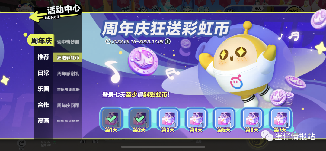 ①蛋仔们登录游戏,打开活动中心,在“周年庆”一栏中找到【狂送彩虹币】,即可领取6枚以上彩虹币,登录七天至少可以得到54枚彩虹币!