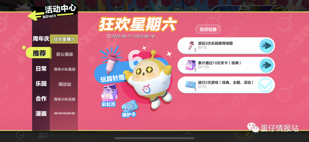 ③蛋仔们在6月17日至6月18日登录游戏并完成指定任务<累计通过10次关卡(经典)>,即可领取彩虹币宝箱,打开后可以随机获得3枚彩虹币、4枚彩虹币、5枚彩虹币、6枚彩虹币、18枚彩虹币奖励。同时,进行2次游戏可以获得巅峰派对保护卡,游玩3次乐园推荐地图可以免费获得配饰【玩具针筒】。