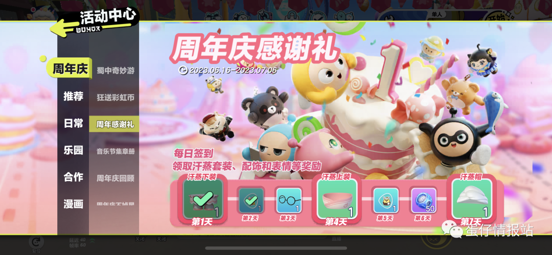 ②蛋仔们登录游戏,打开活动中心,在“周年庆”一栏中找到【周年感谢礼】,完成签到即可签到奖励,里面有汗蒸套装、全新表情,还有细框眼镜配饰!
