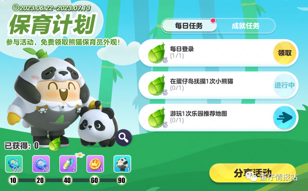 蛋仔派对“熊猫保育员”活动在6月22日开启,到7月13日结束,活动持续3个礼拜,蛋仔们通过完成指定的每日任务和成就任务,可以获得竹笋,其中每日任务有3个,分别为“每日登录”、“在蛋仔岛抚摸1次大熊猫”、“游玩1次乐园推荐地图”,完成全部每日任务可以获得15个竹笋,当竹笋数量达到90个,就能免费领取【熊猫保育员】皮肤了。