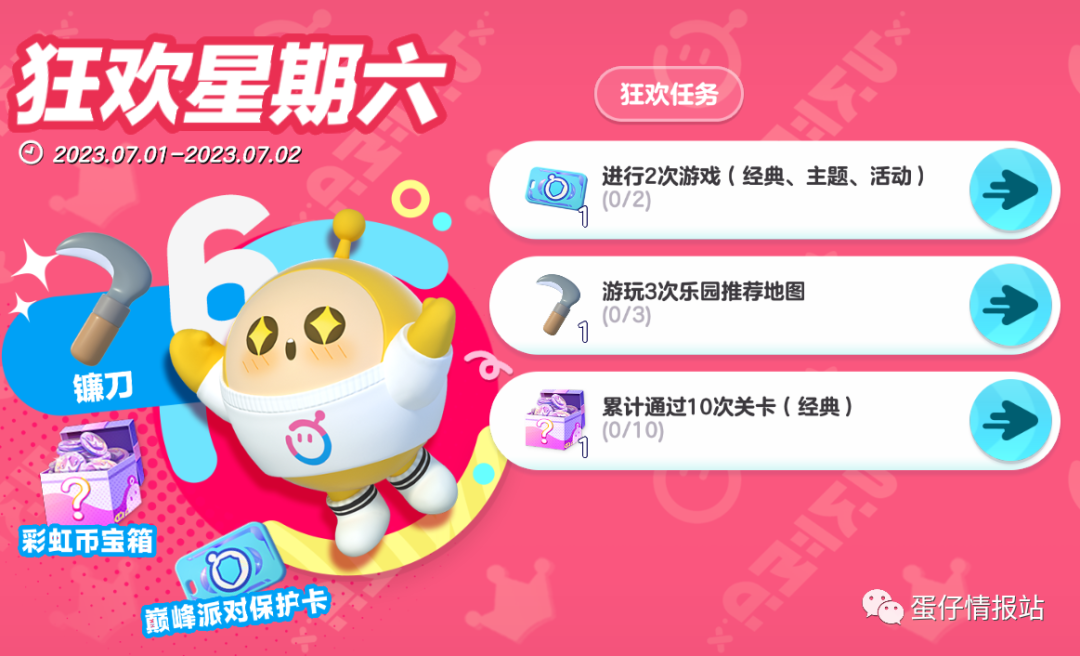 蛋仔们在7月1日至7月2日登录游戏并完成指定任务<累计通过10次关卡(经典)>,即可领取彩虹币宝箱,打开后可以随机获得3枚彩虹币、4枚彩虹币、5枚彩虹币、6枚彩虹币、18枚彩虹币奖励。同时,进行2次游戏可以获得巅峰派对保护卡,游玩3次乐园推荐地图可以免费获得配饰【镰刀】。