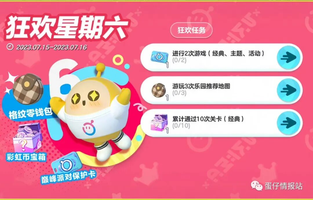 蛋仔们在活动期间登录游戏并完成指定任务就能获得对应奖励,其中完成<累计通过10次关卡(经典)>,即可获得彩虹币宝箱;完成<游玩3次乐园推荐地图>,即可获得配饰【格纹零钱包】;完成<进行2次游戏(经典、主题、活动)>,即可获得1张巅峰派对保护卡。