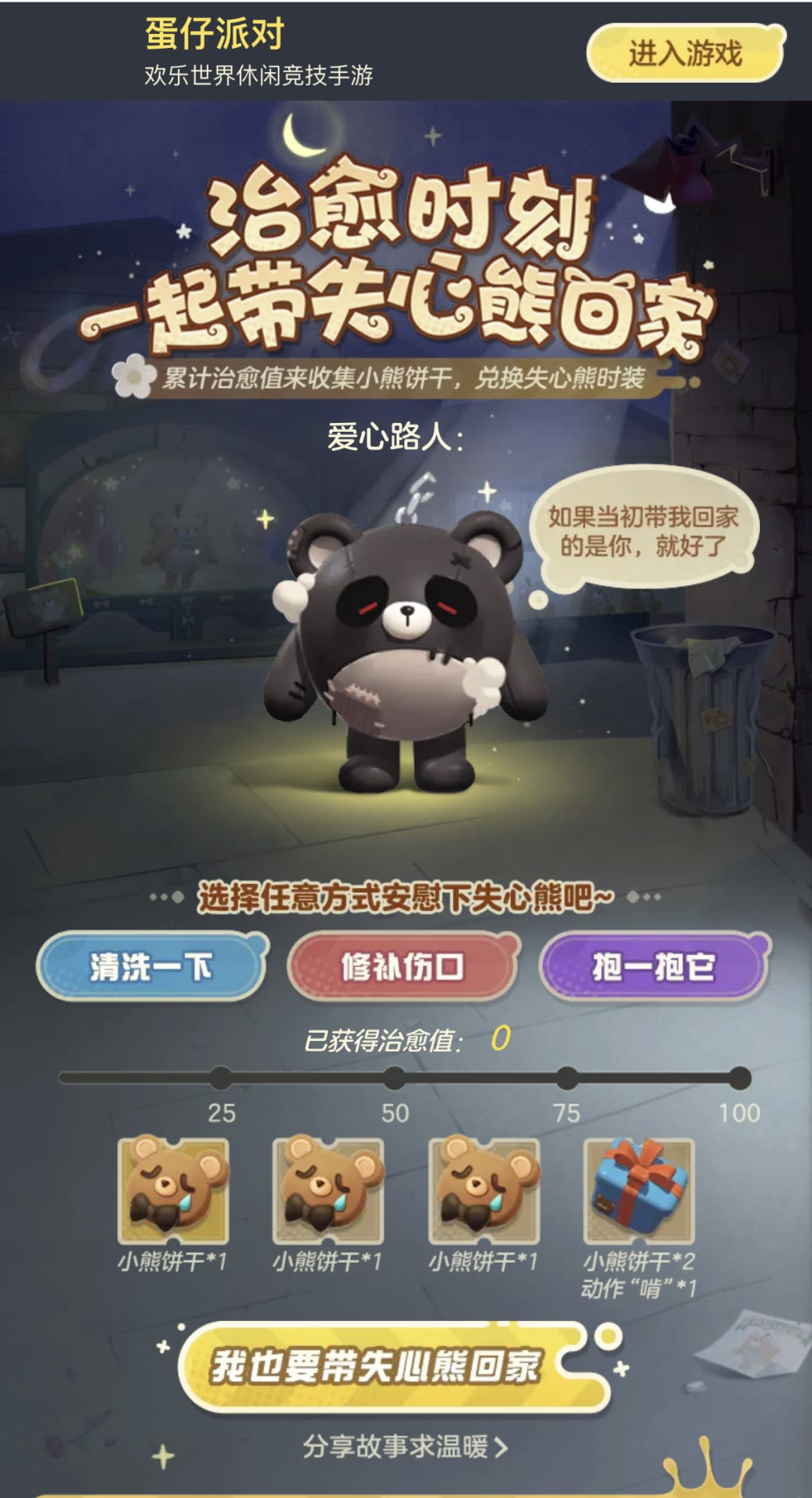 有一只迷失的黑色小熊在街头孤单徘徊,拖着残破的身体不知前往何处,空洞的眼神中透露着内心的迷惘与无助,蛋仔玩家们邀上好友一起助力小熊回家吧,带它回到温暖幸福的家,治愈它受伤的心。
