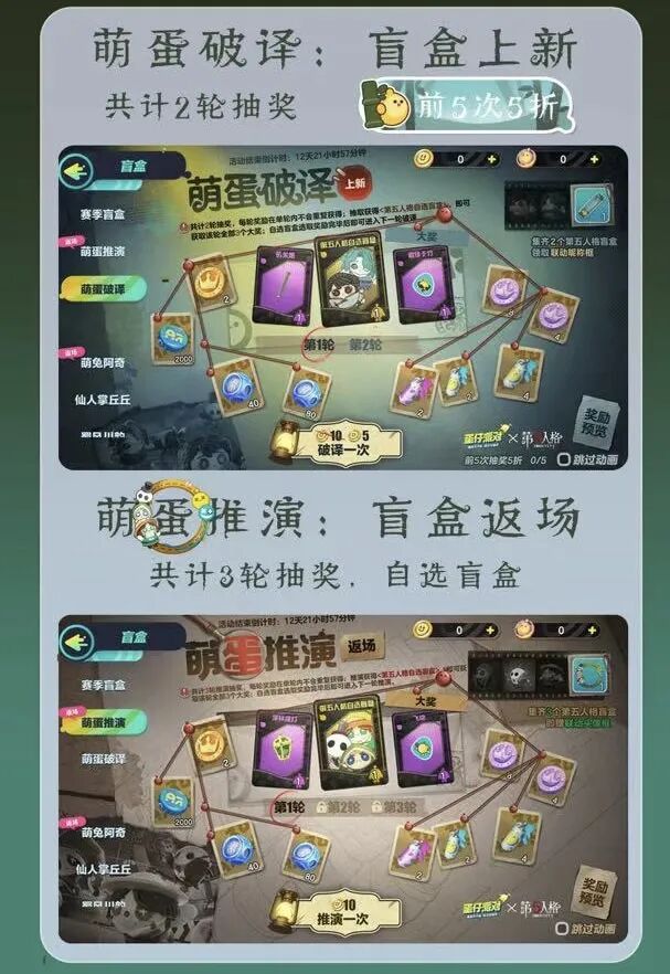 第五人格联动分为两个奖池,其中【萌蛋破译】为新更新奖池,共计2轮抽奖,可以抽出渔女、古董商联动皮肤,还有联动动作和配饰;【萌蛋推演】为第一期奖池,共计3轮抽奖,可以抽出杰克、园丁、佣兵联动皮肤,还有联动动作和配饰。