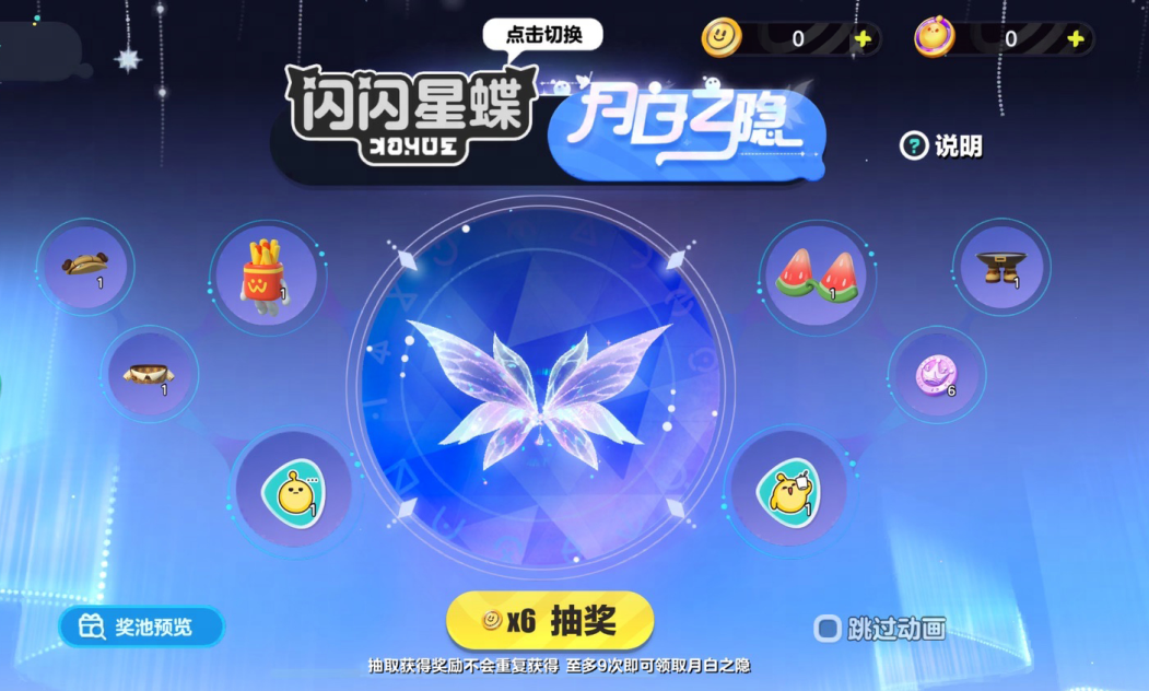 在7月27日12::00,蛋仔玩家登陆蛋仔派对游戏,在盲盒--配饰盲盒中使用许愿币抽奖,即有机会获得【月白之隐】至臻翅膀。同【闪闪星蝶】奖池一样,奖池中包括9个奖励,包括【月白之隐】至臻配饰、【薯条弟弟】【西瓜眼镜】典藏配饰、表情、旺旺套装、彩虹币奖励。每个奖励抽中概率不一样,已抽取到物品的概率将分到未获得的剩余物品上。