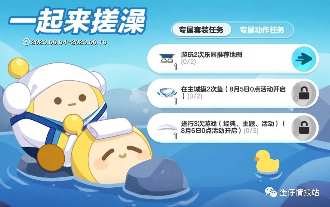 专属套装任务共有三个,完成“游玩2次乐园推荐地图”可以获得搓澡师傅下装,完成“在主城摸2次鱼”可以获得搓澡师傅上装,完成“进行2次游戏(经典、主题、活动)”可以获得搓澡师傅帽子。