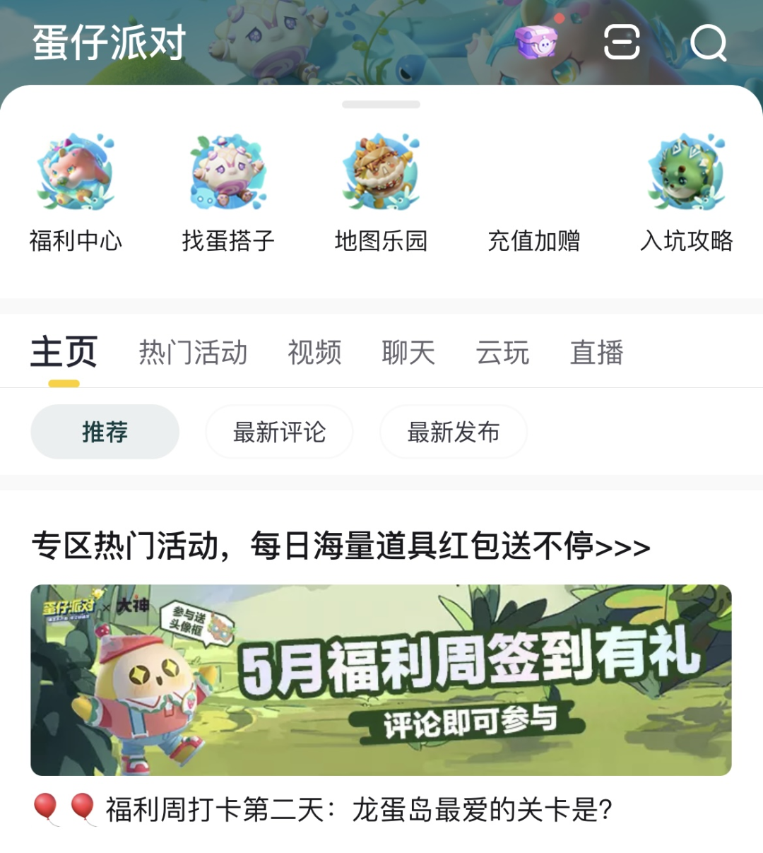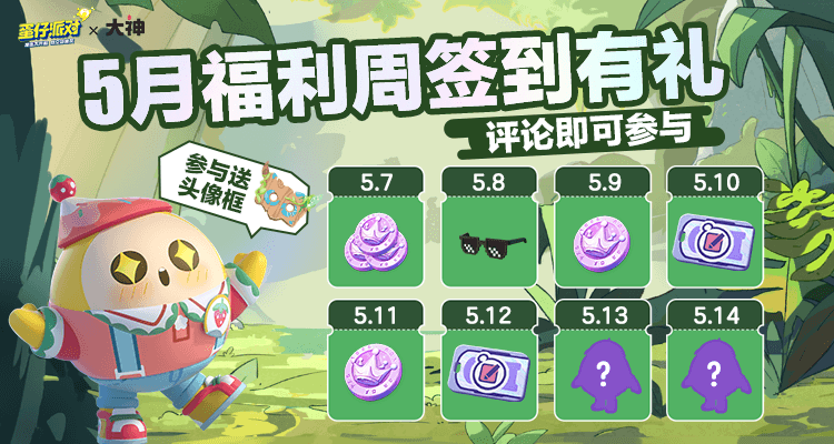 下面告诉蛋仔们怎么参与活动:打开网易大神app,在蛋仔派对专栏主页找到【5月福利周签到有礼】专区热门活动,点进去就可以参与当天的福利周打卡活动了。