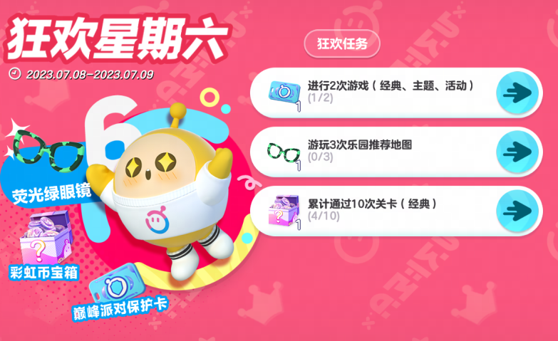 每周狂欢星期六的奖励都是1张巅峰派对保护卡、1个彩虹币宝箱(随机开出3到18枚彩虹币)、1个稀有配饰(每周都会更新不同的配饰)。其中1张巅峰派对保护卡对应“进行2次游戏(经典、主题、活动)”任务、1个彩虹币宝箱对应“累计通过10次关卡(经典)”任务、1个稀有配饰对应“游玩3次乐园推荐活动”任务。